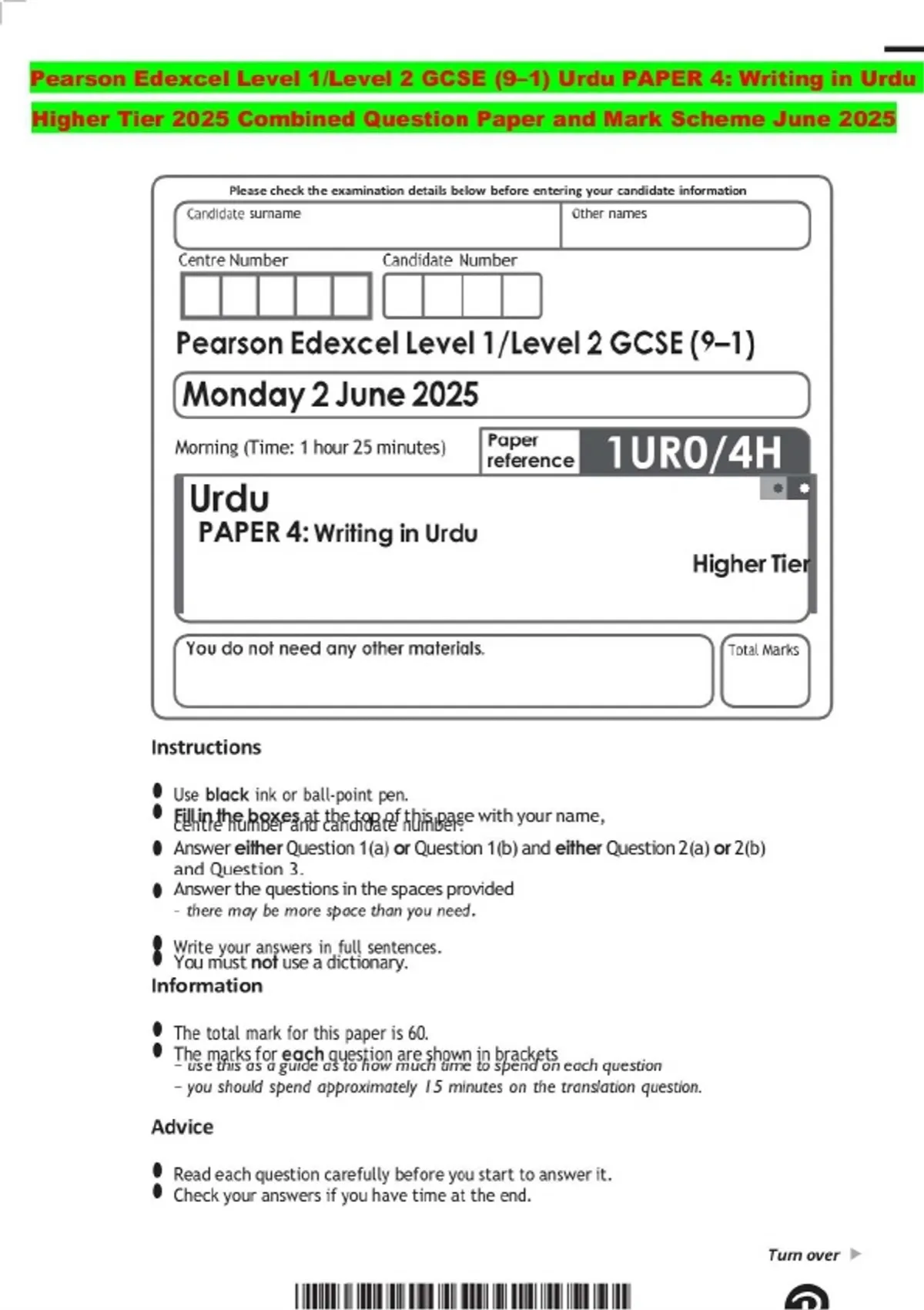 Pearson Edexcel Level 1/Level 2 GCSE (9–1) Urdu PAPER 4: Writing in Urdu Higher Tier 2025 Combined Question Paper and Mark Scheme June 2025