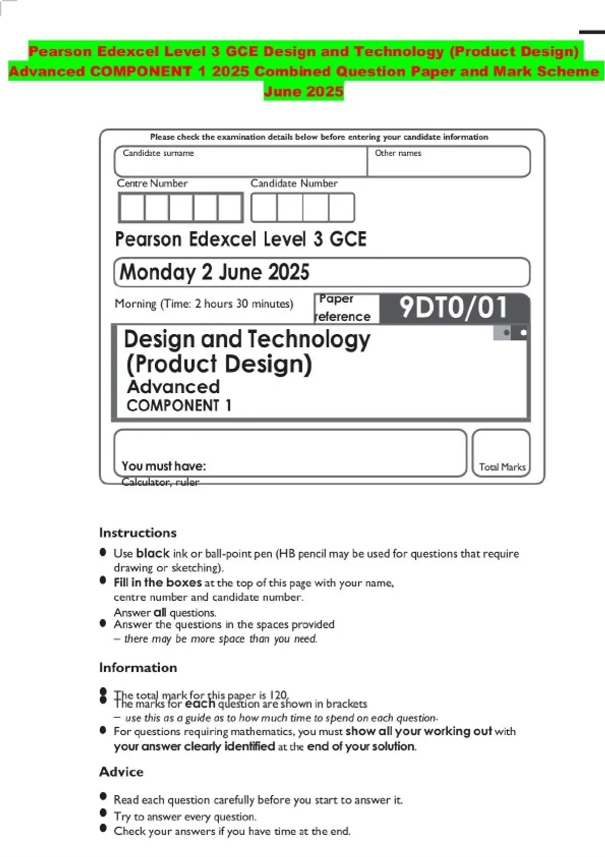 Pearson Edexcel Level 3 GCE Design and Technology (Product Design) Advanced COMPONENT 1 2025 Combined Question Paper and Mark Scheme June 2025