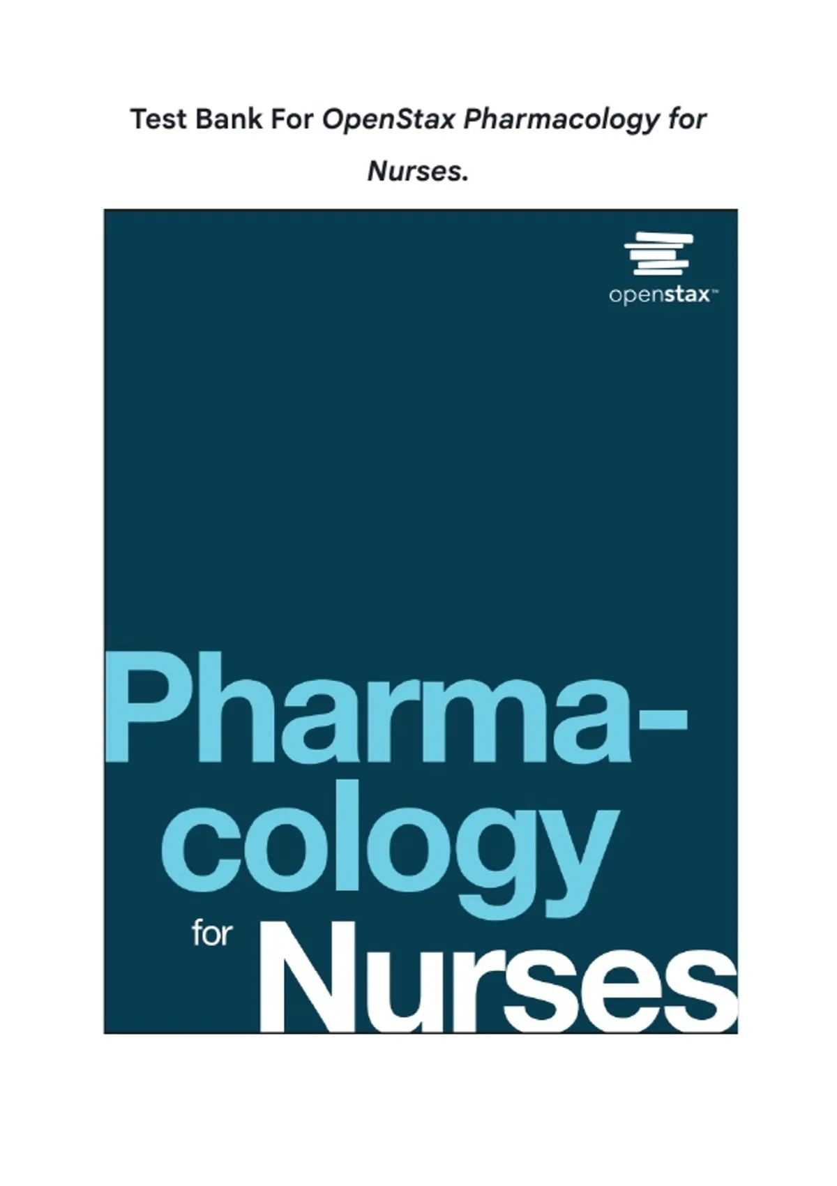 This document contains the full chapter-organized test bank for OpenStax Pharmacology for Nurses. It includes NCLEX-style multiple-choice questions with verified answers and detailed rationales across all major pharmacology units, including drug administration, ethics and safety, homeostasis, electrolytes, immune and inflammatory drugs, neuropharmacology, cardiovascular drugs, respiratory and endocrine agents, gastrointestinal therapies, renal and urinary drugs, reproductive pharmacology, and sensory/dermatologic medications. The material closely follows the textbook’s structure and is designed for quizzes, exams, and comprehensive pharmacology review in nursing programs.