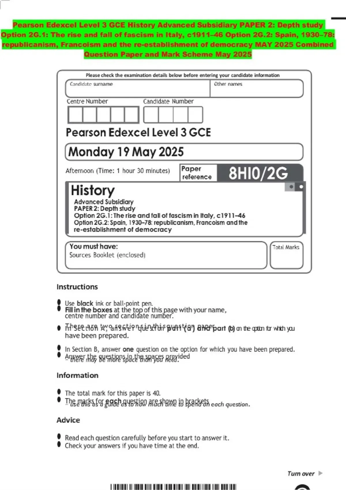 Pearson Edexcel Level 3 GCE History Advanced Subsidiary PAPER 2: Depth study Option 2G.1: The rise and fall of fascism in Italy, c1911–46 Option 2G.2: Spain, 1930–78: republicanism, Francoism and the re-establishment of democracy MAY 2025 Combined Questio