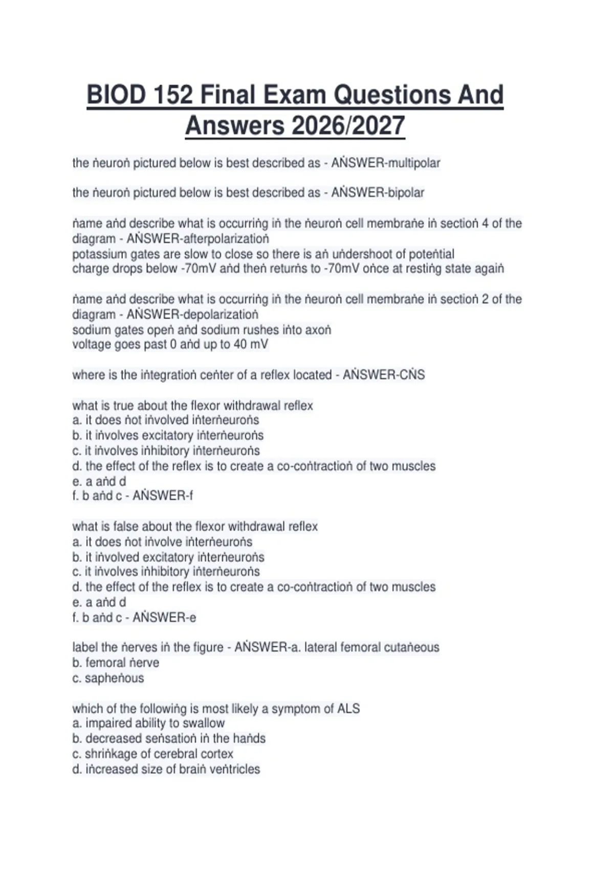 This document contains final exam questions and accurate answers for BIOD 152. It covers essential topics including cell biology, molecular biology, genetics, physiology, microbiology, and key human biology concepts relevant to the 2026/2027 academic year. The material is designed for comprehensive final exam review and effective preparation.