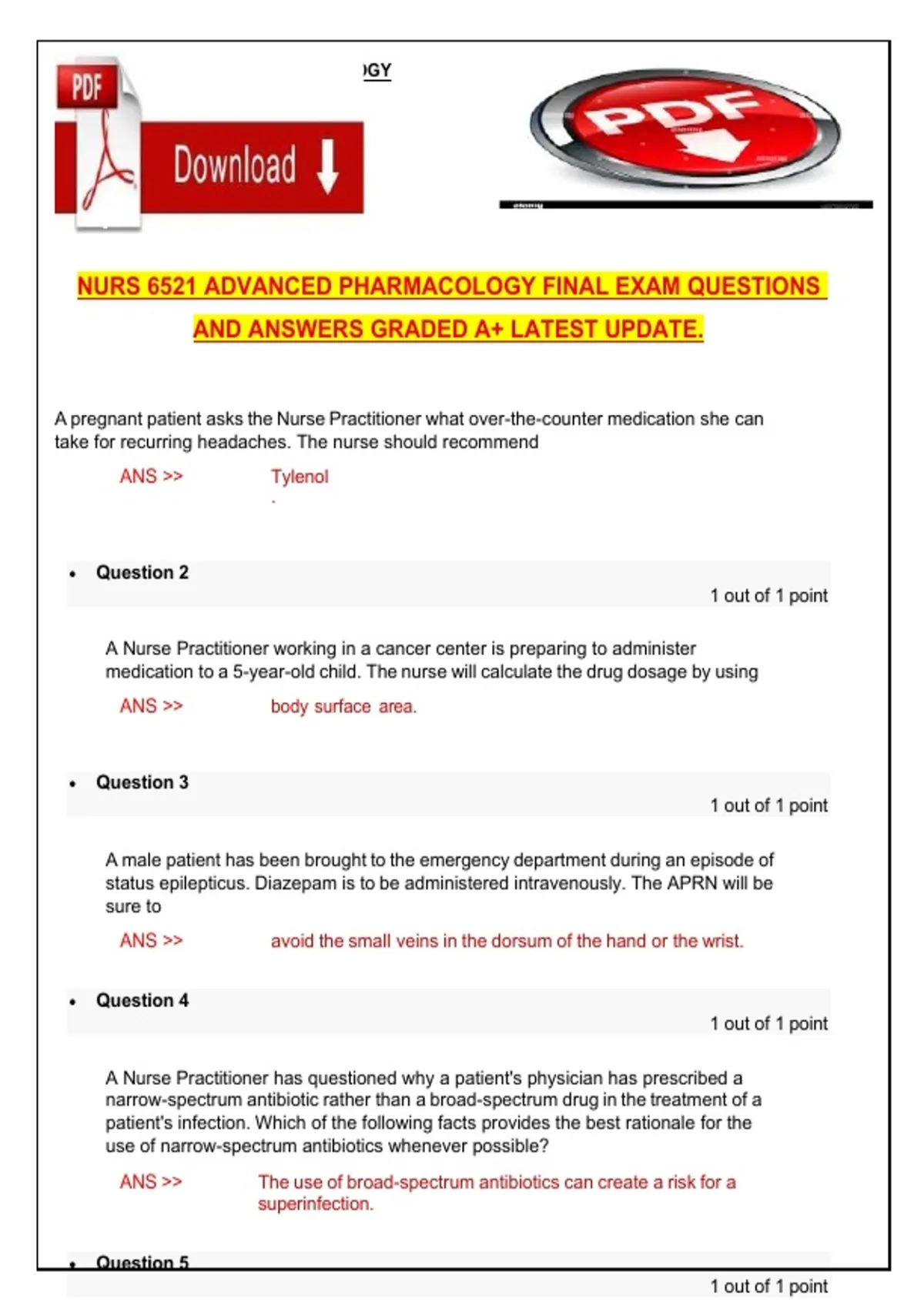 This document provides the latest updated NURS 6521 Advanced Pharmacology final exam questions with clear, accurate answers. It covers core pharmacology topics including drug mechanisms, pharmacokinetics and pharmacodynamics, adverse effects, contraindications, and clinical application relevant to the final exam.