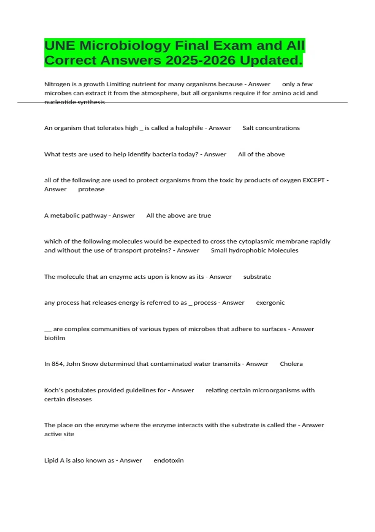 Nitrogen is a growth Limiting nutrient for many organisms because - Answer only a few microbes can extract it from the atmosphere, but all organisms require if for amino acid and nucleotide synthesis An organism that tolerates high _ is called a halophile - Answer Salt concentrations What tests are used to help identify bacteria today? - Answer All of the above all of the following are used to protect organisms from the toxic by products of oxygen EXCEPT - Answer protease A metabolic pathway - Answer All the above are true which of the following molecules would be expected to cross the cytoplasmic membrane rapidly and without the use of transport proteins? - Answer Small hydrophobic Molecules The molecule that an enzyme acts upon is know as its - Answer substrate any process hat releases energy is referred to as _ process - Answer exergonic __ are complex communities of various types of microbes that adhere to surfaces - Answer biofilm In 854, John Snow determined that contaminated water transmits - Answer Cholera Koch's postulates provided guidelines for - Answer relating certain microorganisms with certain diseases The place on the enzyme where the enzyme interacts with the substrate is called the - Answer active site Lipid A is also known as - Answer endotoxin
