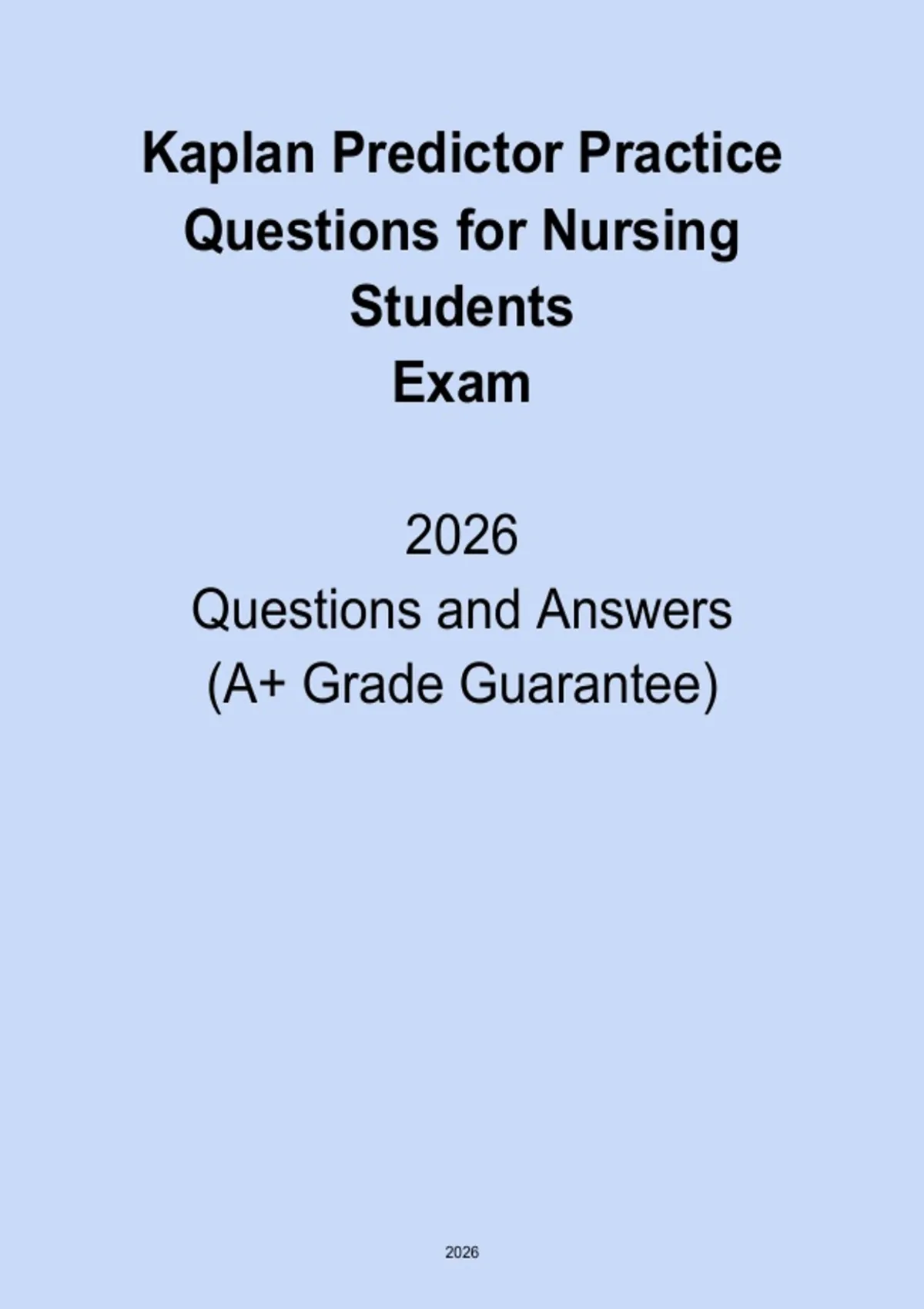 Prepare for exam readiness with Kaplan 2026 Predictor Practice Questions, a focused PDF resource for nursing students designed to mirror the style and difficulty of Kaplan predictor exams. This guide helps strengthen clinical judgment, improve test-taking confidence, and identify knowledge gaps through realistic practice questions aligned with nursing program expectations. Ideal for students preparing for predictor exams and NCLEX readiness, this resource supports effective practice and improved performance.