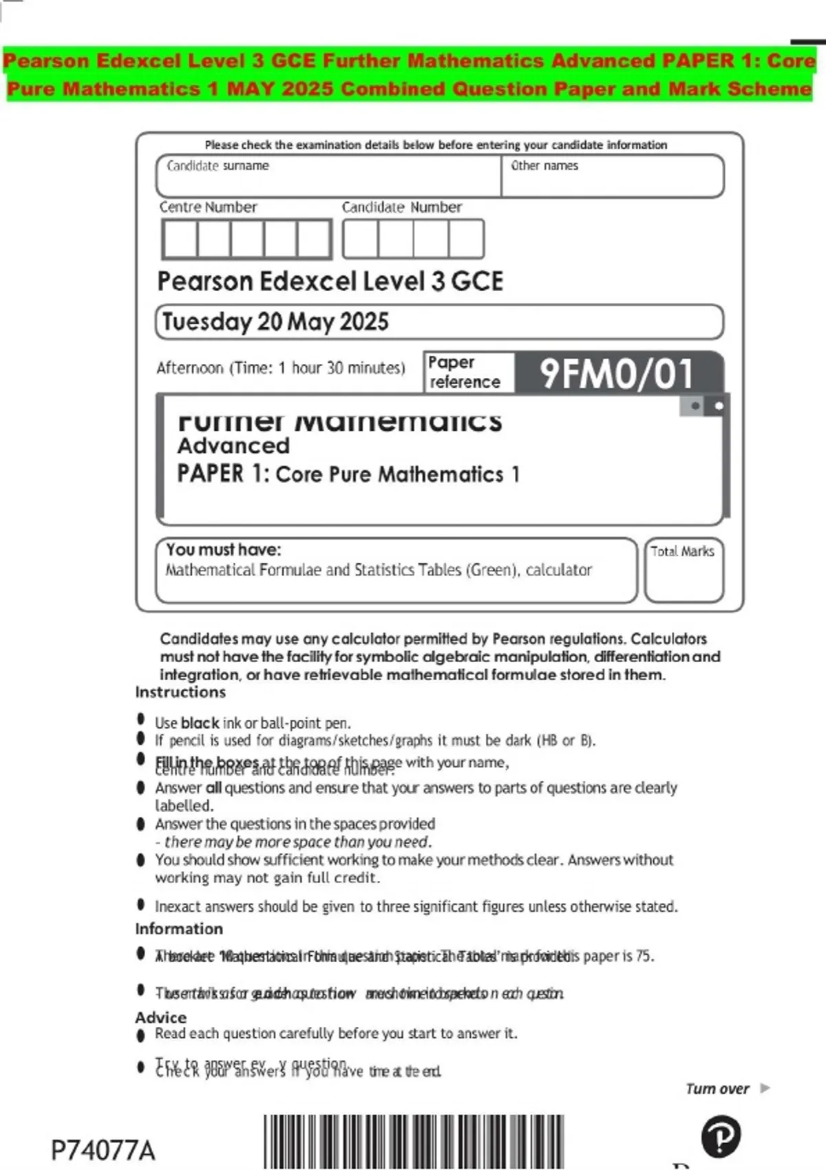 Pearson Edexcel Level 3 GCE Further Mathematics Advanced PAPER 1: Core Pure Mathematics 1 MAY 2025 Combined Question Paper and Mark Scheme