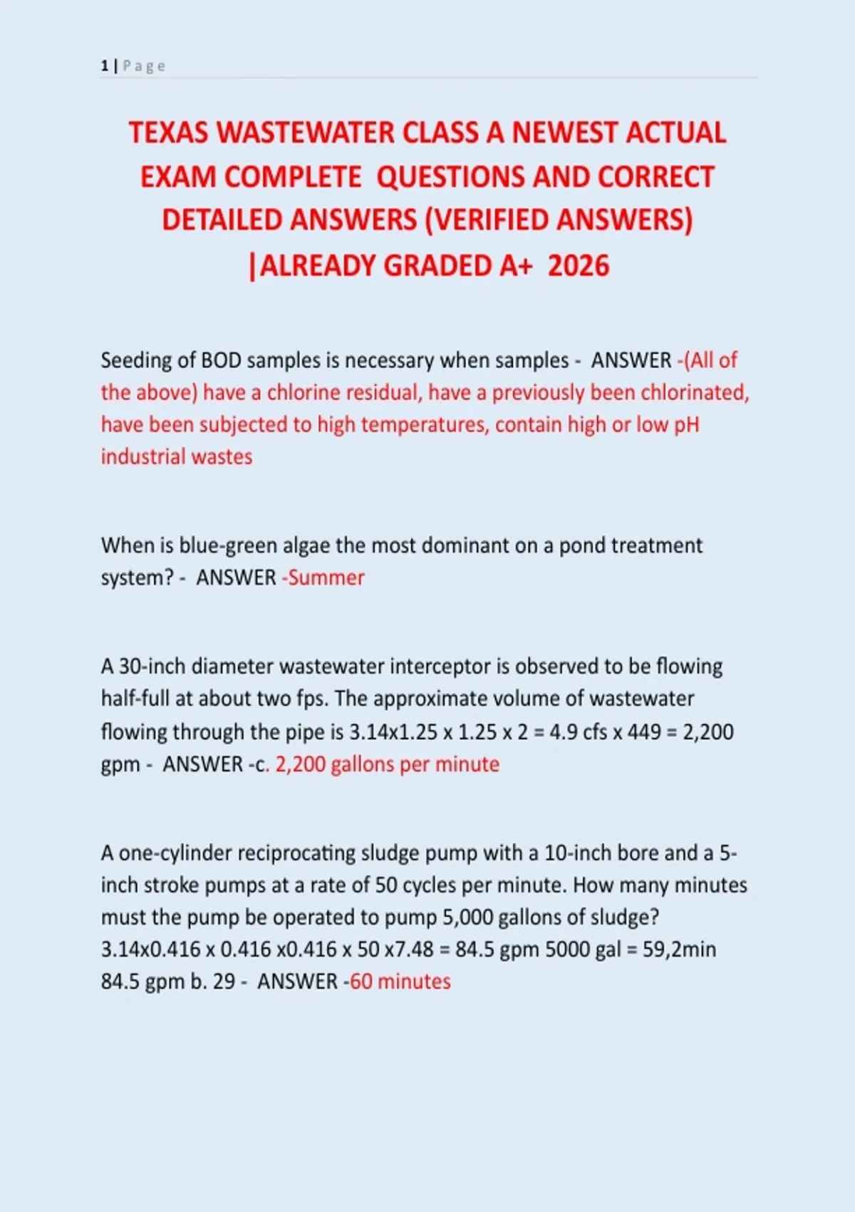 TEXAS WASTEWATER CLASS A NEWEST ACTUAL EXAM COMPLETE QUESTIONS AND CORRECT DETAILED ANSWERS (VERIFIED ANSWERS) |ALREADY GRADED A+ 2026