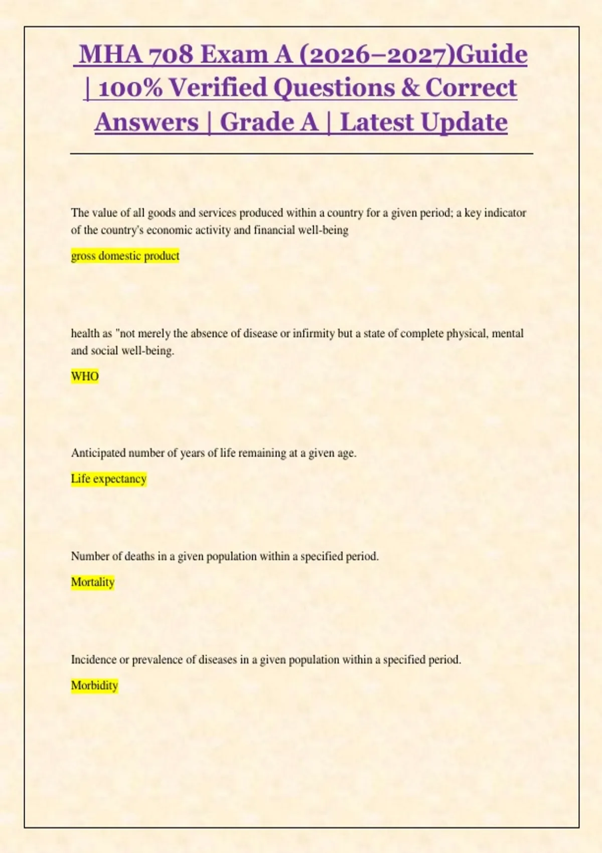 This document contains Exam A for the MHA 708 course, focusing on key concepts, theories, and applications relevant to healthcare administration and management. It is designed as exam material to support revision and exam preparation, helping students practice with realistic questions aligned to the course content.