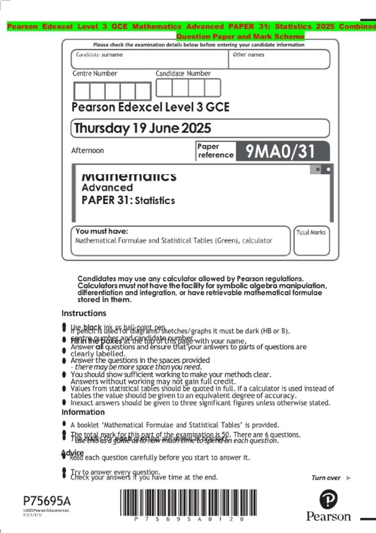 Pearson Edexcel Level 3 GCE Mathematics Advanced PAPER 31: Statistics 2025 Combined Question Paper and Mark Scheme