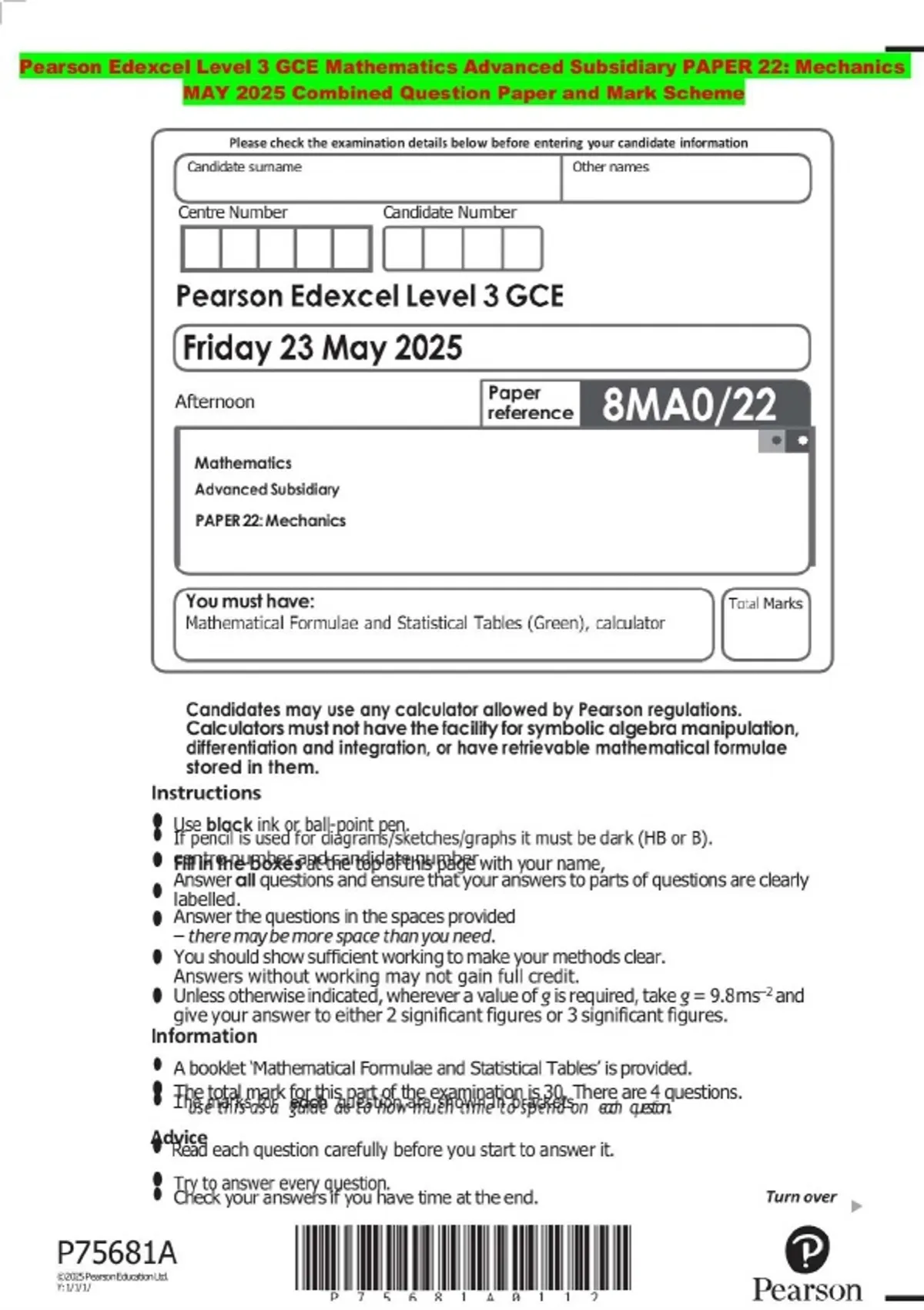 Pearson Edexcel Level 3 GCE Mathematics Advanced Subsidiary PAPER 22: Mechanics MAY 2025 Combined Question Paper and Mark Scheme