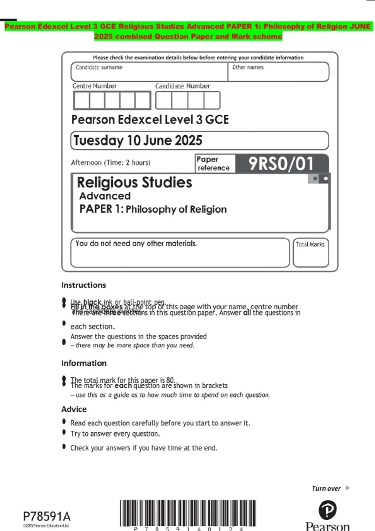 Pearson Edexcel Level 3 GCE Religious Studies Advanced PAPER 1: Philosophy of Religion JUNE 2025 combined Question Paper and Mark scheme
