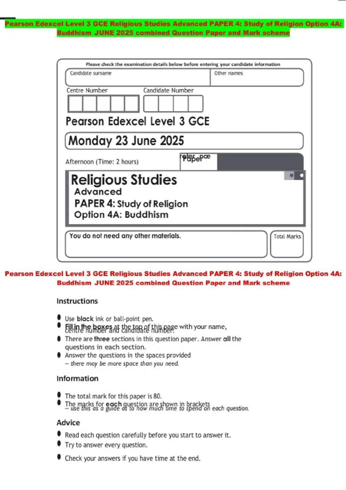Pearson Edexcel Level 3 GCE Religious Studies Advanced PAPER 4: Study of Religion Option 4A: Buddhism JUNE 2025 combined Question Paper and Mark scheme