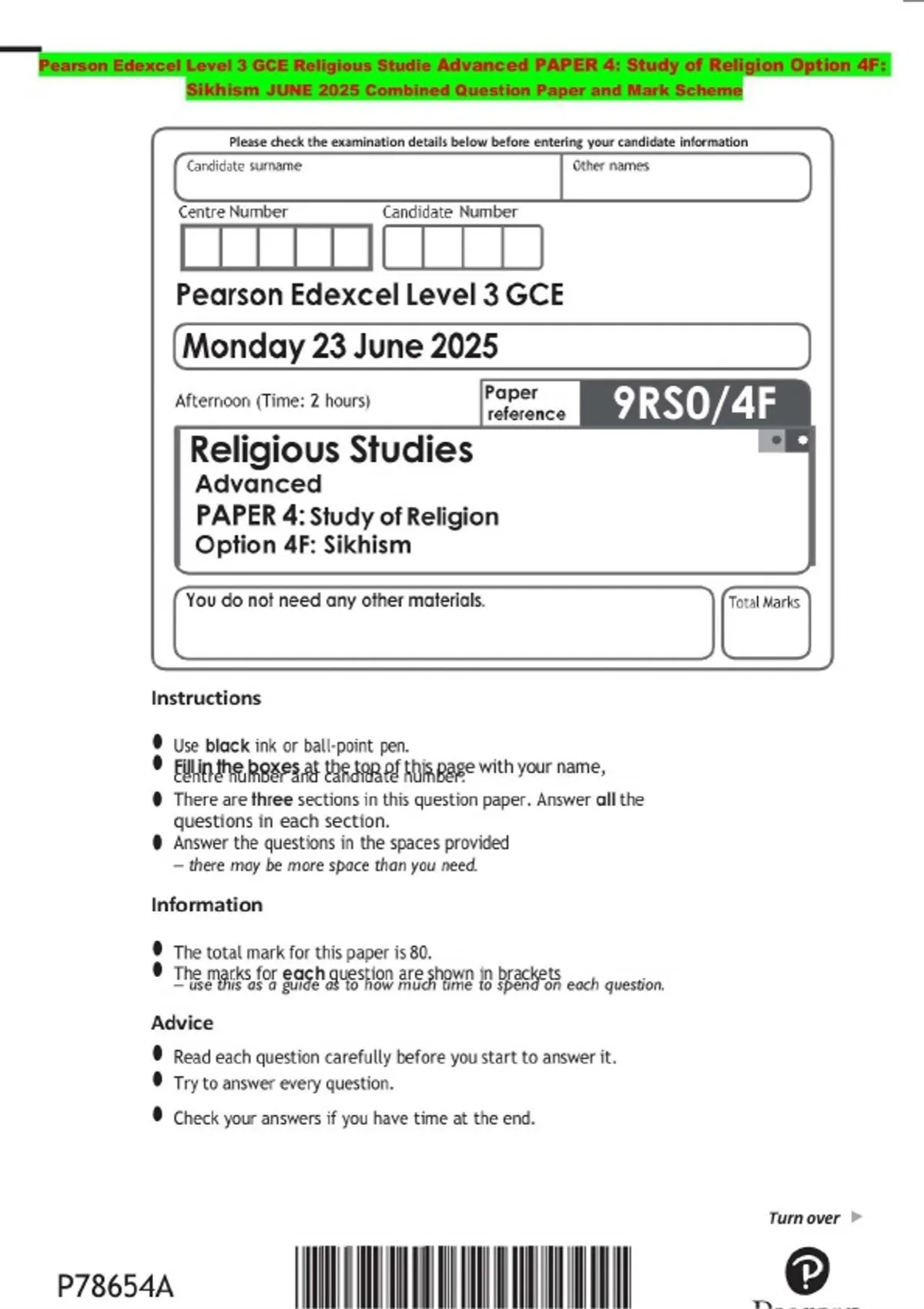 Pearson Edexcel Level 3 GCE Religious Studie Advanced PAPER 4: Study of Religion Option 4F: Sikhism JUNE 2025 Combined Question Paper and Mark Scheme