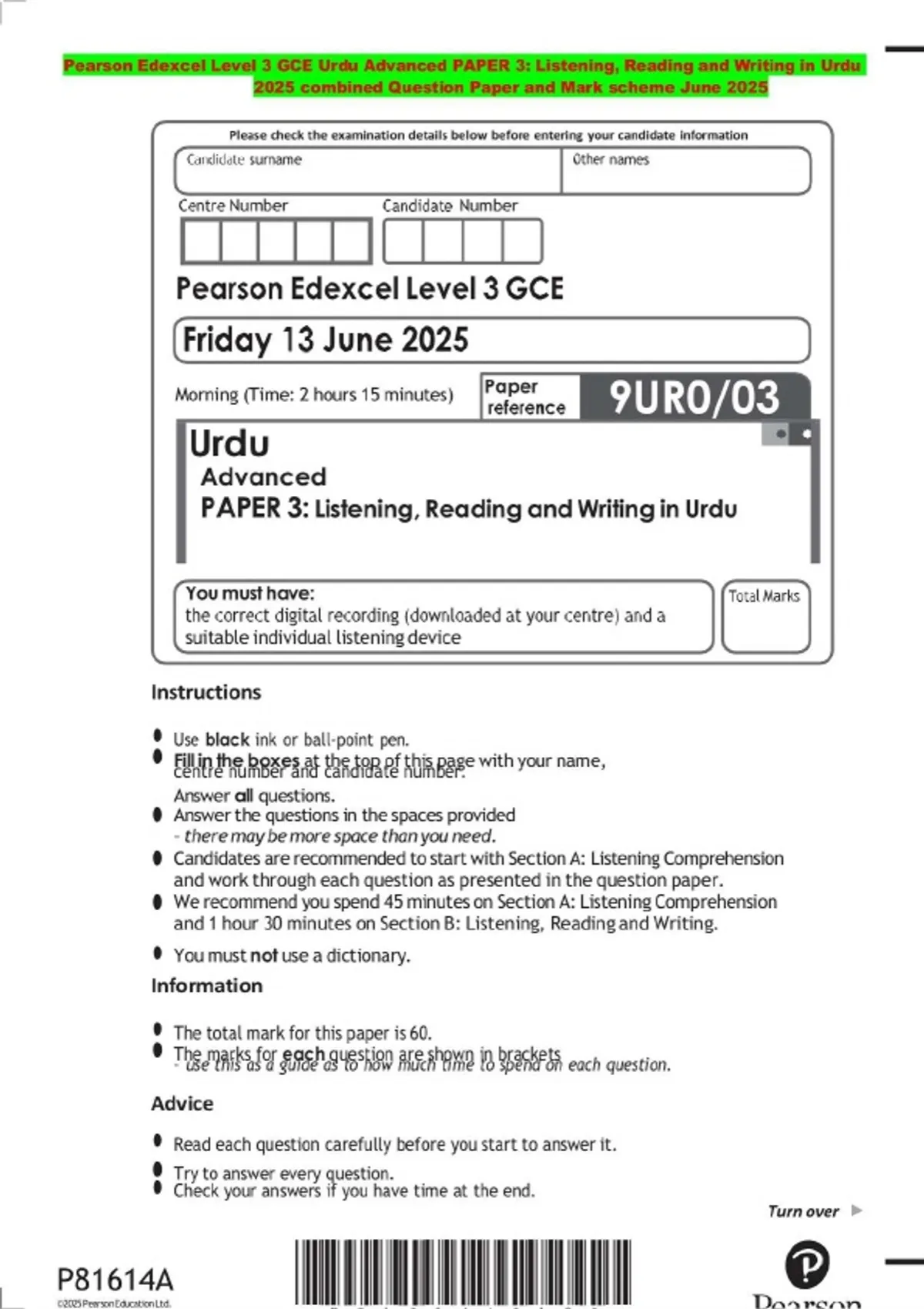 Pearson Edexcel Level 3 GCE Urdu Advanced PAPER 3: Listening, Reading and Writing in Urdu 2025 combined Question Paper and Mark scheme June 2025