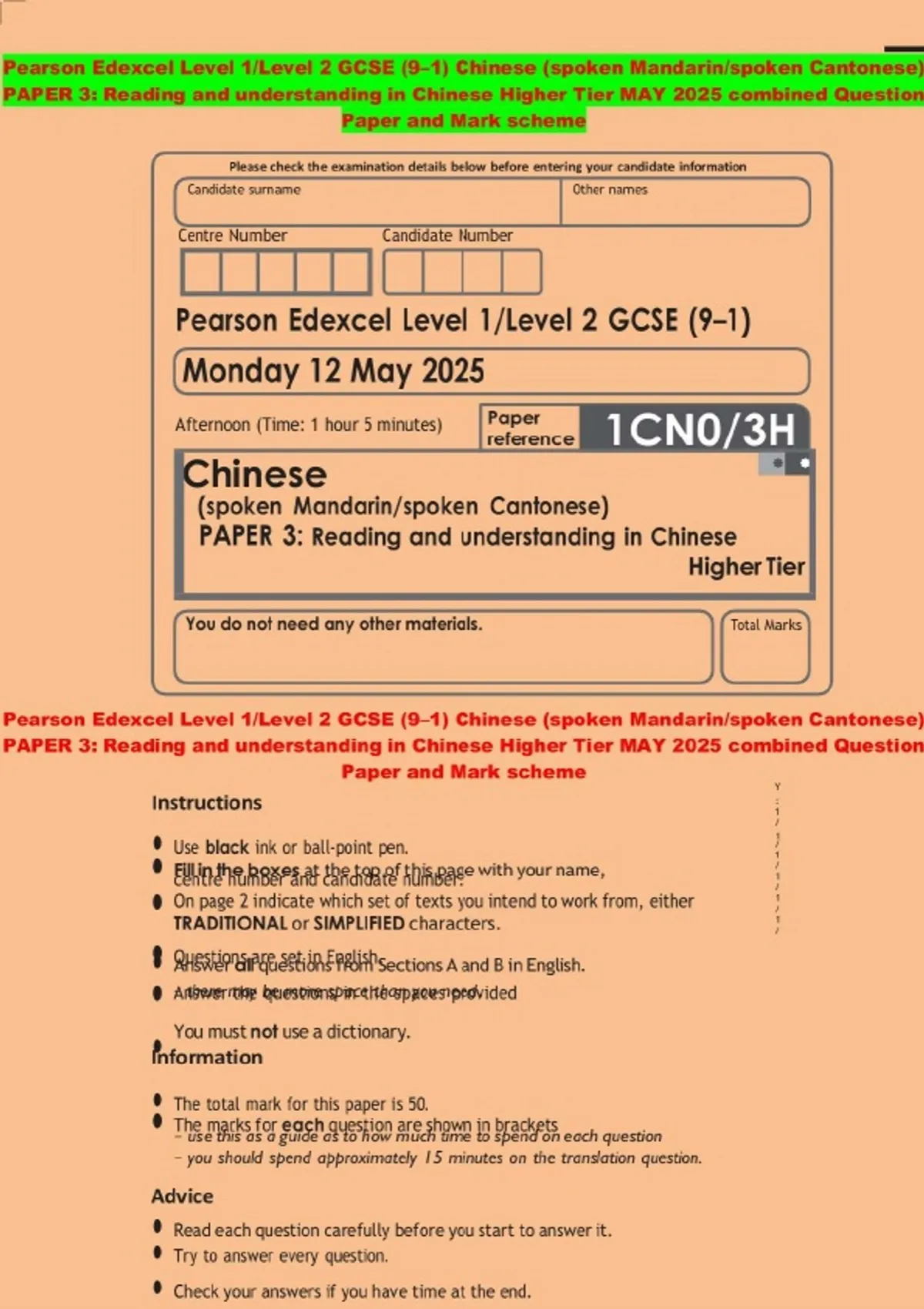 Pearson Edexcel Level 1/Level 2 GCSE (9–1) Chinese (spoken Mandarin/spoken Cantonese) PAPER 3: Reading and understanding in Chinese Higher Tier MAY 2025 combined Question Paper and Mark scheme