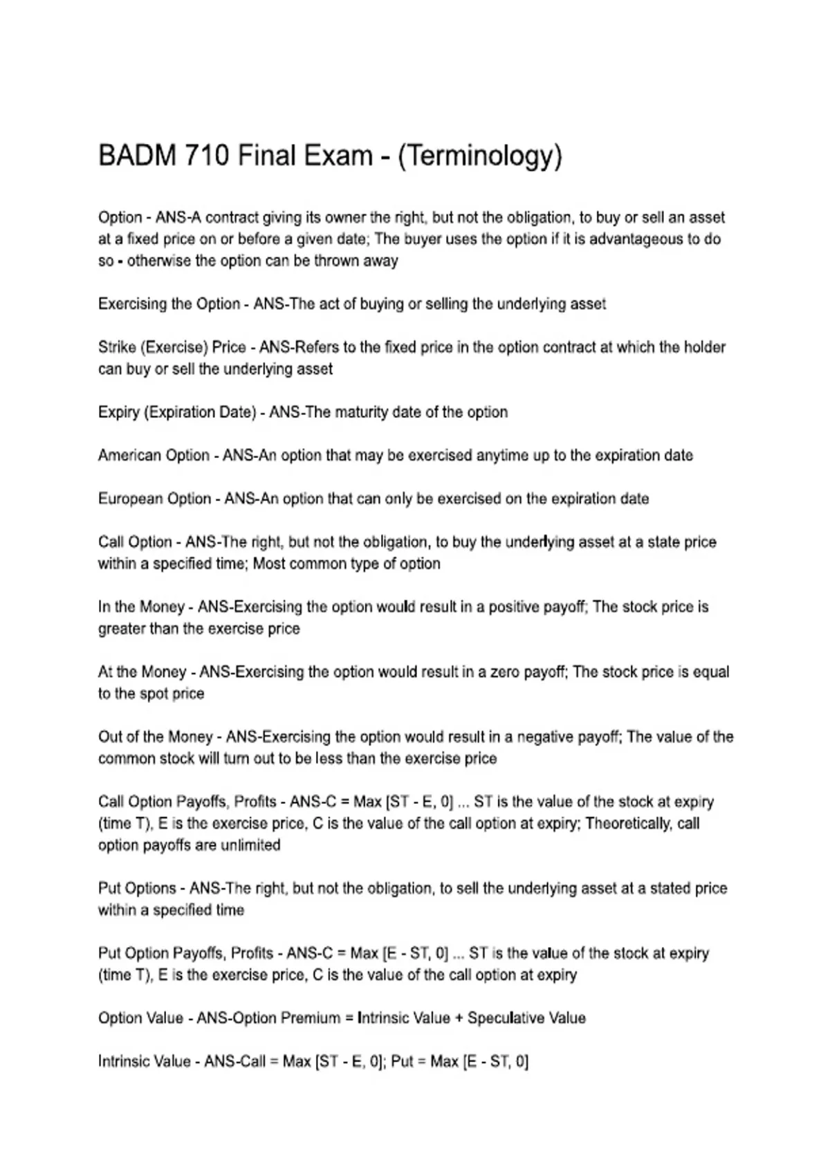 This resource contains comprehensive terminology questions and answers for the BADM 710 Final Exam, designed to help MBA students master key strategic management terms and concepts. It covers essential terminology related to strategy formulation, implementation, corporate governance, organizational change, performance evaluation, leadership strategies, and competitive advantage.