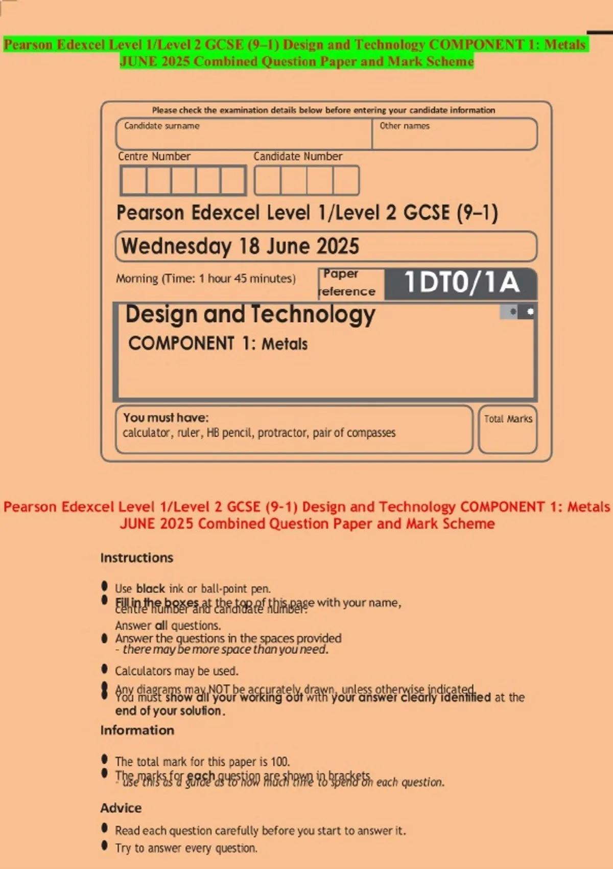 Pearson Edexcel Level 1/Level 2 GCSE (9–1) Design and Technology COMPONENT 1: Metals JUNE 2025 Combined Question Paper and Mark Scheme
