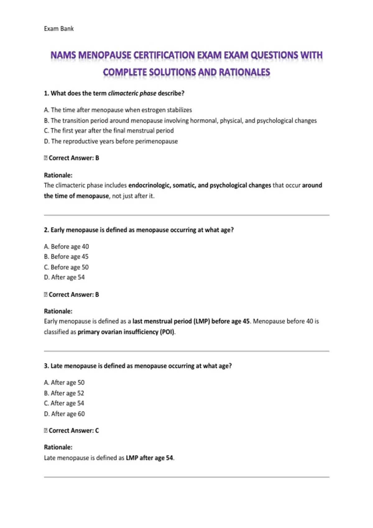 NAMS MENOPAUSE CERTIFICATION EXAM EXAM QUESTIONS WITH COMPLETE SOLUTIONS AND RATIONALES