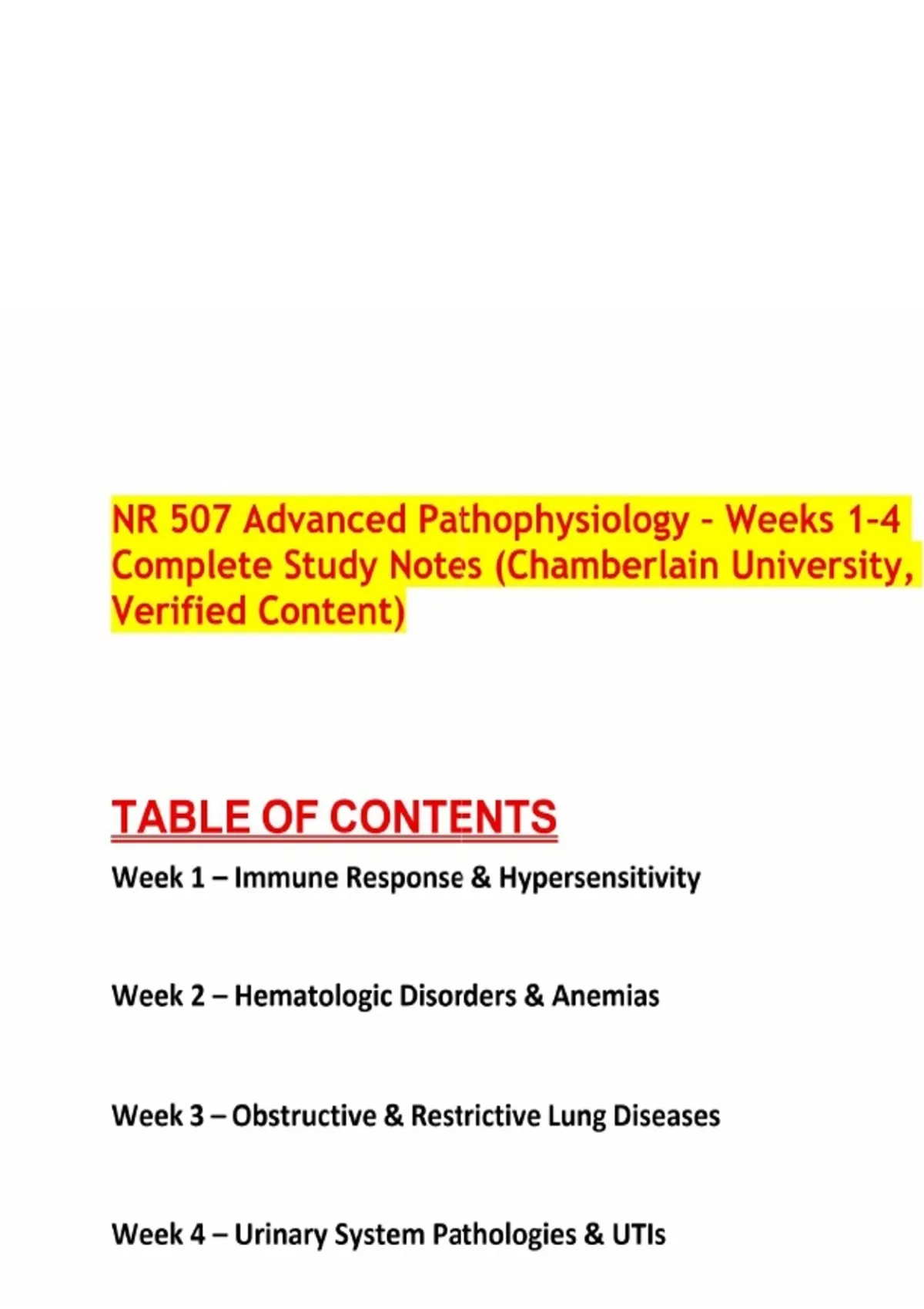 NR 507 Advanced Pathophysiology – Weeks 1–4 Complete Study Notes (Chamberlain University, Verified Content)This NR 507 Advanced Pathophysiology Study Guide covers Weeks 1–4 of Chamberlain University’s curriculum, providing clear, exam‑ready notes for graduate nursing students. It organizes complex pathophysiology topics into concise explanations, tables, and Q&A format to make studying easier and more effective. Content Highlights: - Week 1 – Immune Response & Hypersensitivity - Types I–IV hypersensitivity reactions, mechanisms, examples, and clinical implications. - Primary vs. secondary immunodeficiencies, autoimmune diseases, and key case examples. - Week 2 – Hematologic Disorders & Anemias - Pathophysiology of anemias, autoimmune hematologic conditions, and immune deficiencies. - Week 3 – Obstructive & Restrictive Lung Diseases - COPD, asthma, pulmonary fibrosis, sarcoidosis, and PFT interpretation. - Week 4 – Urinary System Pathologies & UTIs - Glomerulonephritis, nephrotic syndrome, UTIs, early renal damage screening, and anasarca. Key Benefits: - Comprehensive coverage of Weeks 1–4 topics in NR 507. - Verified notes aligned with Chamberlain University’s advanced nursing curriculum. - Perfect for exam prep, quick review, and clinical application. - Organized for rapid recall and last‑minute study sessions