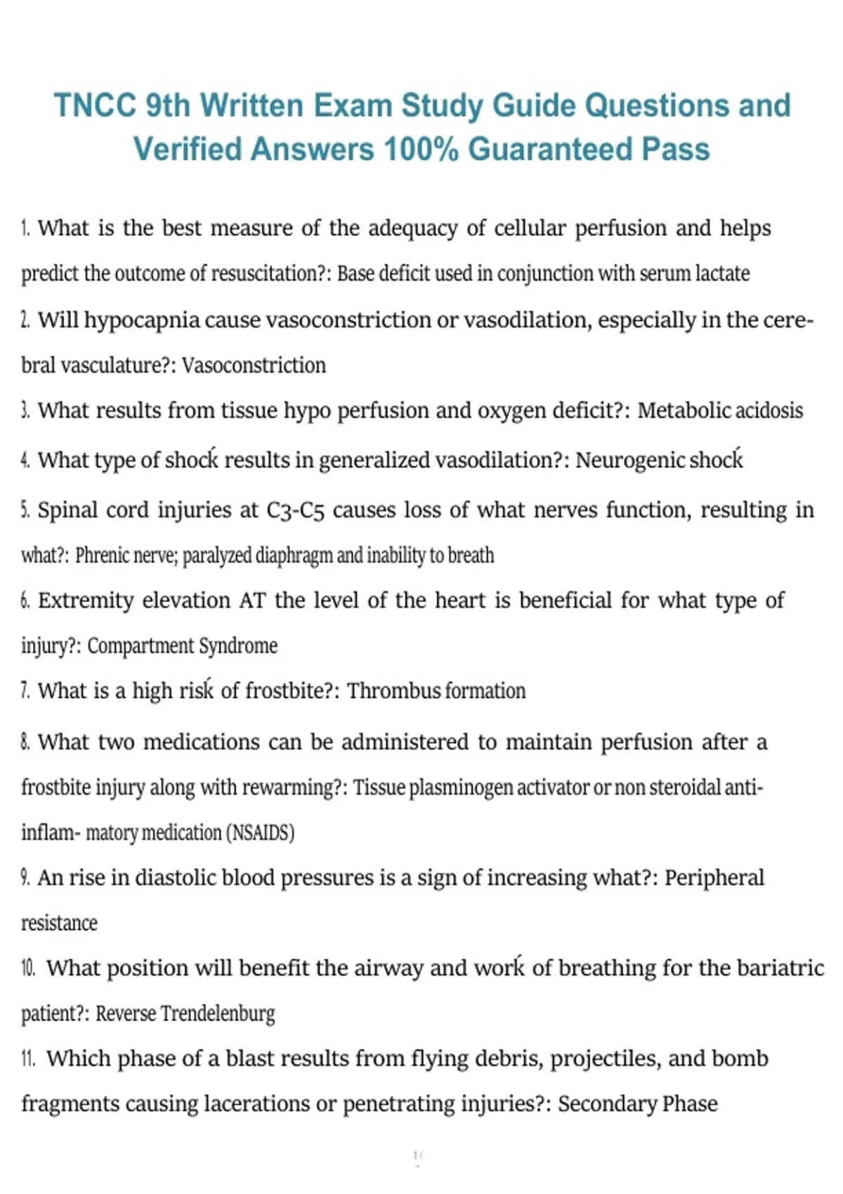 This study guide provides TNCC 9th Edition written exam questions with fully verified answers designed to support successful exam preparation. It covers the Trauma Nursing Process (TNP), primary and secondary surveys, shock and hemorrhage management, trauma assessment priorities, and emergency nursing interventions tested on the written exam. The material is structured for focused review, self-testing, and confident performance on the TNCC exam.