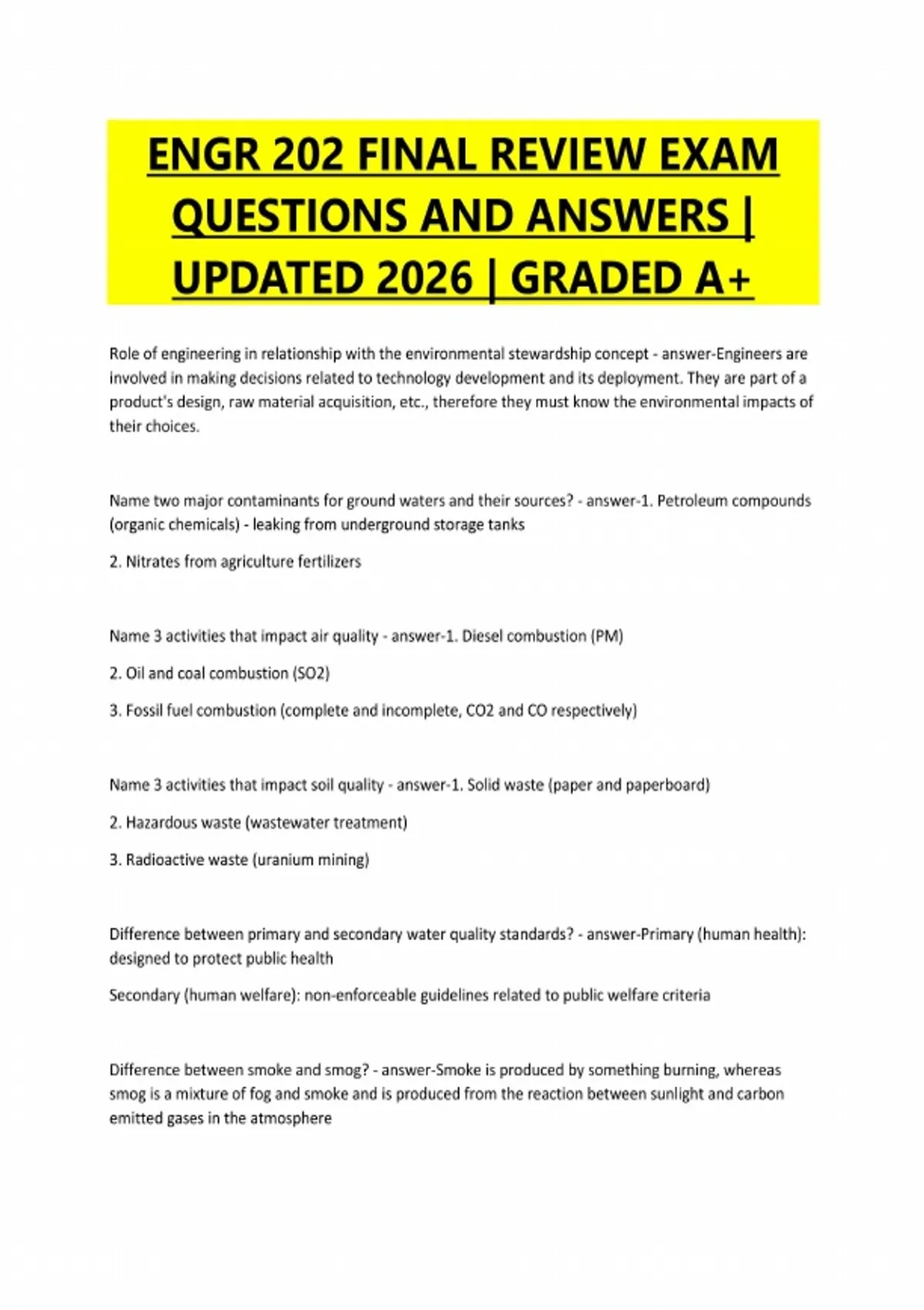 ENGR 202 FINAL REVIEW EXAM QUESTIONS AND ANSWERS | UPDATED 2026 | GRADED A+ Role of engineering in relationship with the environmental stewardship concept - answer-Engineers are involved in making decisions related to technology development and its deployment. They are part of a product's design, raw material acquisition, etc., therefore they must know the environmental impacts of their choices. Name two major contaminants for ground waters and their sources? - answer-1. Petroleum compounds (organic chemicals) - leaking from underground storage tanks 2. Nitrates from agriculture fertilizers Name 3 activities that impact air quality - answer-1. Diesel combustion (PM) 2. Oil and coal combustion (SO2) 3. Fossil fuel combustion (complete and incomplete, CO2 and CO respectively) Name 3 activities that impact soil quality - answer-1. Solid waste (paper and paperboard) 2. Hazardous waste (wastewater treatment) 3. Radioactive waste (uranium mining) Difference between primary and secondary water quality standards? - answer-Primary (human health): designed to protect public health Secondary (human welfare): non-enforceable guidelines related to public welfare criteria Difference between smoke and smog? - answer-Smoke is produced by something burning, whereas smog is a mixture of fog and smoke and is produced from the reaction between sunlight and carbon emitted gases in the atmosphereWhat are the 4 characteristics of hazardous wastes? - answer--Ignitability: ability to burn -Corrosivity: ability to corrode metals -Reactivity: ability to react violently with other substances, even with water -Toxicity: ability to threaten human health and welfare Wavelength of IR and UV radiation - answer-UV: below 3e-6 m IR: above 3e-6 m Average production of solid wastes per capity/perday? - answer-100kg/person/day EPA - answer-Environmental Protection Agency PM - answer-Particulate Matter NAAQS - answer-National Ambient Air Quality Standards IPCC - answer-International Panel on Climate Change T_e - answer-Earth's tempterature What test is used to evaluate toxicity? - answer-TCLP (Toxicity Characteristic Leaching Procedure) If a chemical reaches a certain threshold, then it is toxic Lov level radiation wastes? - answer-Low level of radioactivity across large volumes of materials VOCs - answer-Volatile Organic Compounds