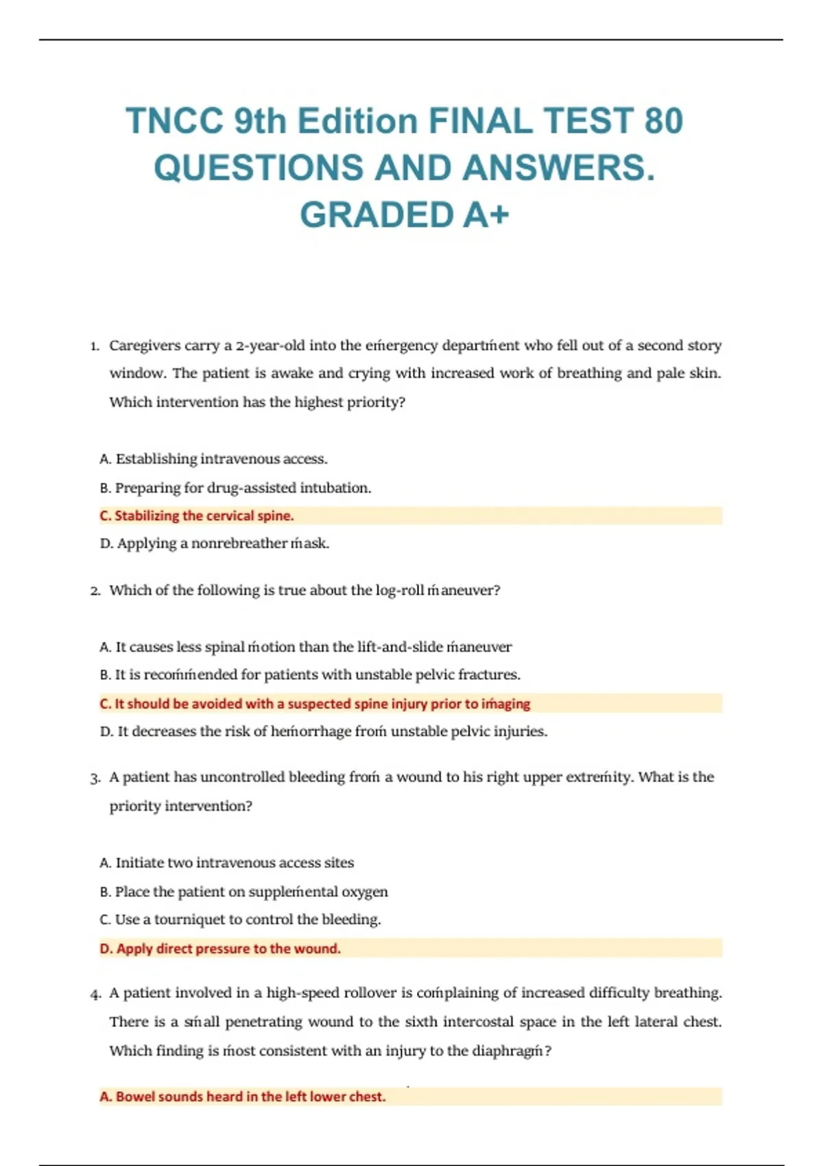 This document contains the TNCC 9th Edition final test with 80 exam-style questions and fully verified answers, graded A+. It covers the Trauma Nursing Process (TNP), primary and secondary surveys, trauma assessment priorities, shock and hemorrhage management, and essential emergency nursing interventions tested on the TNCC exam. The material is ideal for final review, self-testing, and reinforcing trauma nursing knowledge before the exam.