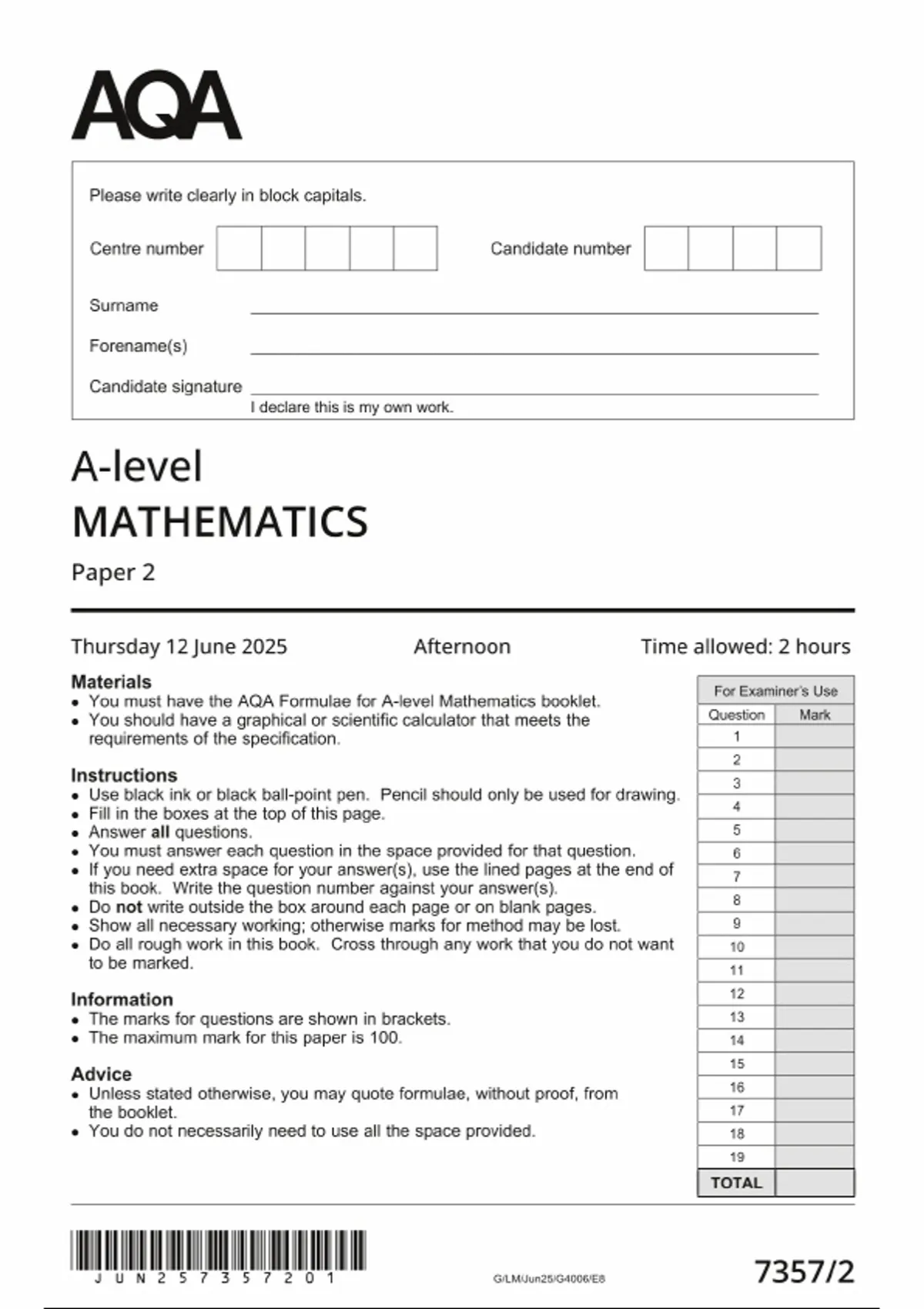 2025 AQA A Level Mathematics Paper 2 (7357/2)