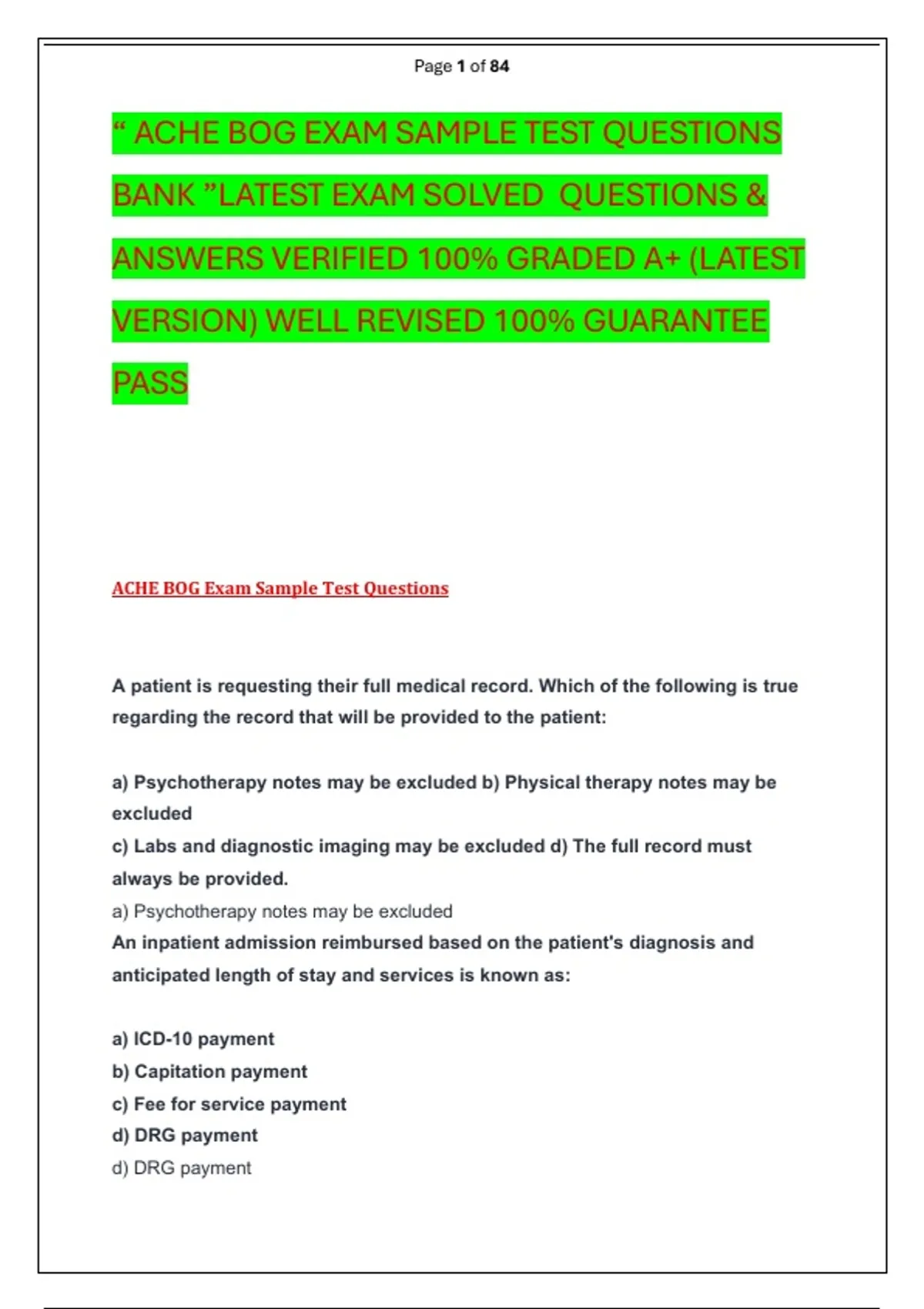 “ ACHE BOG EXAM SAMPLE TEST QUESTIONS
