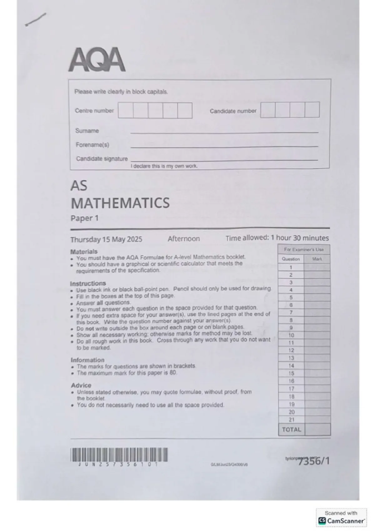 2025 AQA AS Level Mathematics Mark Scheme Paper 1 (7356/1)