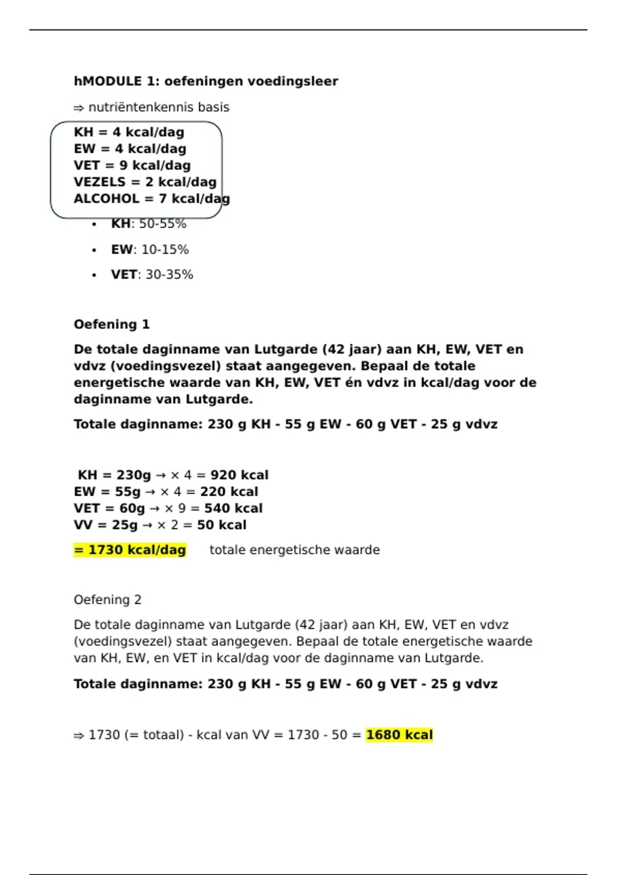 Dit document bevat uitgewerkte oefeningen voedingsleer (modules 1–3) met volledige berekeningen en correcte antwoorden. Onderwerpen die aan bod komen zijn onder andere macronutriënten (KH, EW, VET), energie-inname (kcal), normintervallen, TEE, BMR, PAL, waterbalans, vitamines, voedingsvezels, droge stof en gewichtsverandering. ️ Belangrijk Dit document mag uitsluitend gebruikt worden ter ondersteuning van het leerproces. Het (gedeeltelijk) kopiëren, overnemen of indienen van deze inhoud als eigen werk wordt beschouwd als plagiaat. Geschikt voor studenten Dierenzorg ter voorbereiding op de tussentijdse toets maar ook voor het examen