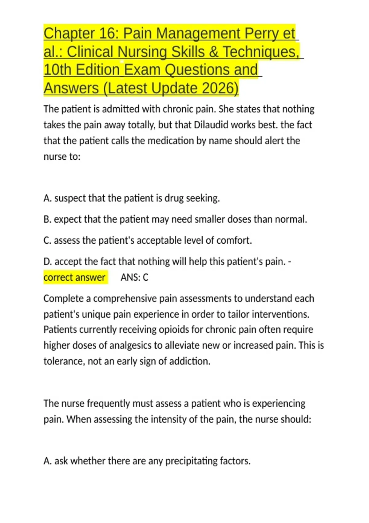Chapter 16 Pain Management Perry et al Clinical Nursing Skills & Techniques, 10th Edition Exam Questions and Answers (Latest Update 2026).docx