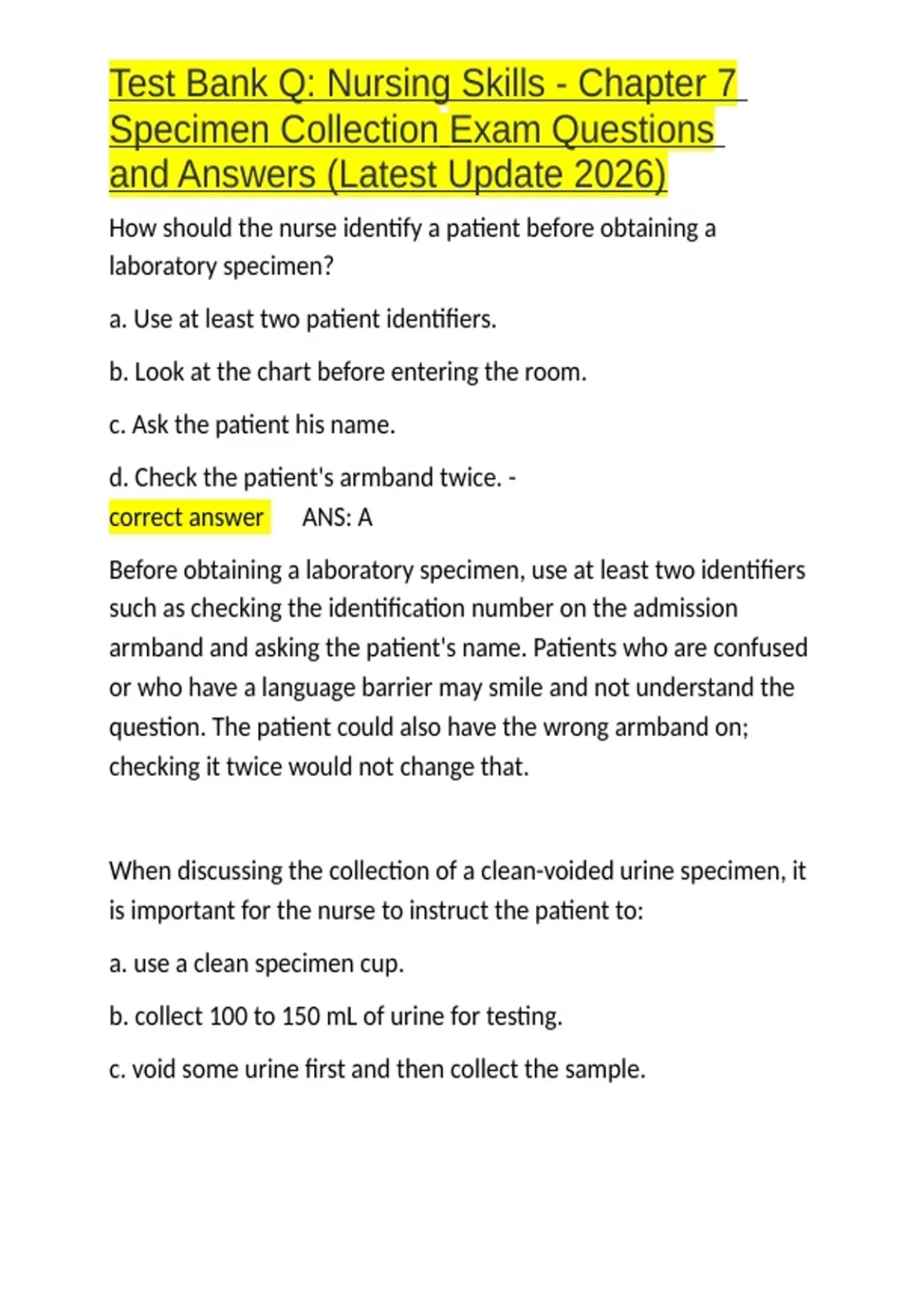 Test Bank Q Nursing Skills - Chapter 7 Specimen Collection Exam Questions and Answers (Latest Update 2026).docxTest Bank Q Nursing Skills - Chapter 7 Specimen Collection Exam Questions and Answers (Latest Update 2026).docx