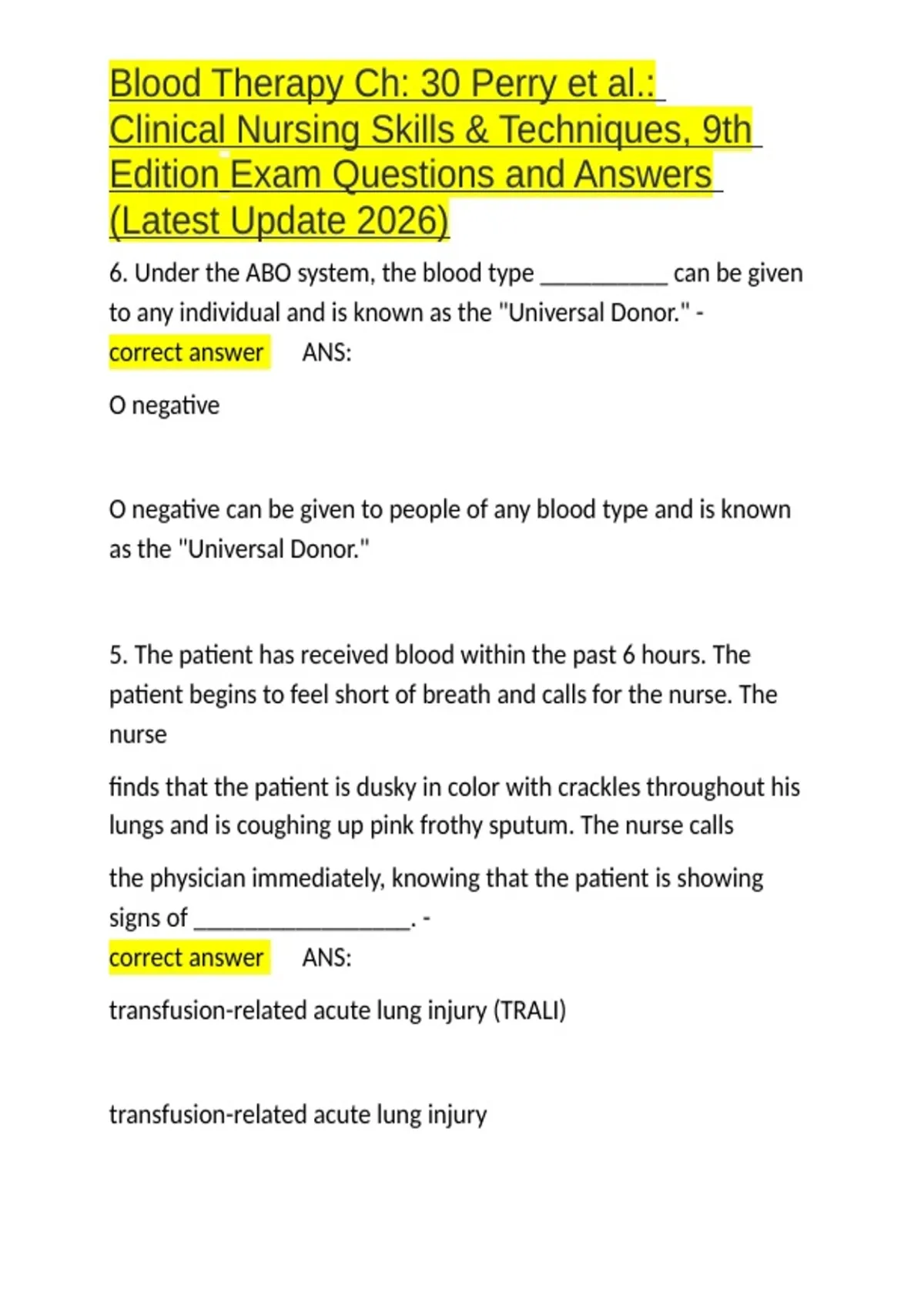 Blood Therapy Ch 30 Perry et al Clinical Nursing Skills & Techniques, 9th Edition Exam Questions and Answers (Latest Update 2026).docx
