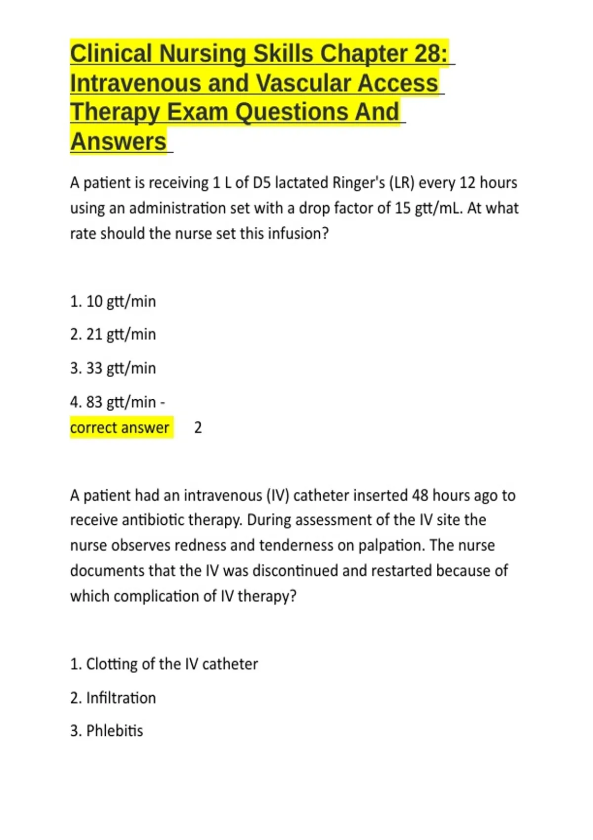 Clinical Nursing Skills Chapter 28 Intravenous and Vascular Access Therapy Exam Questions And A