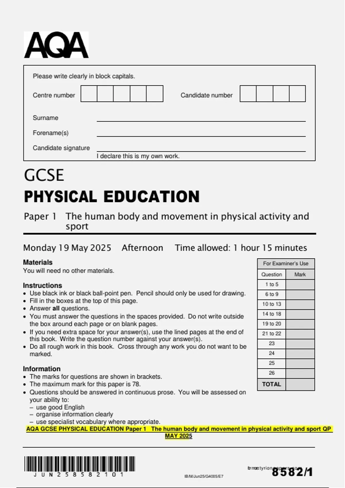 AQA GCSE PHYSICAL EDUCATION Paper 1 The human body and movement in physical activity and sport QP MAY 2025