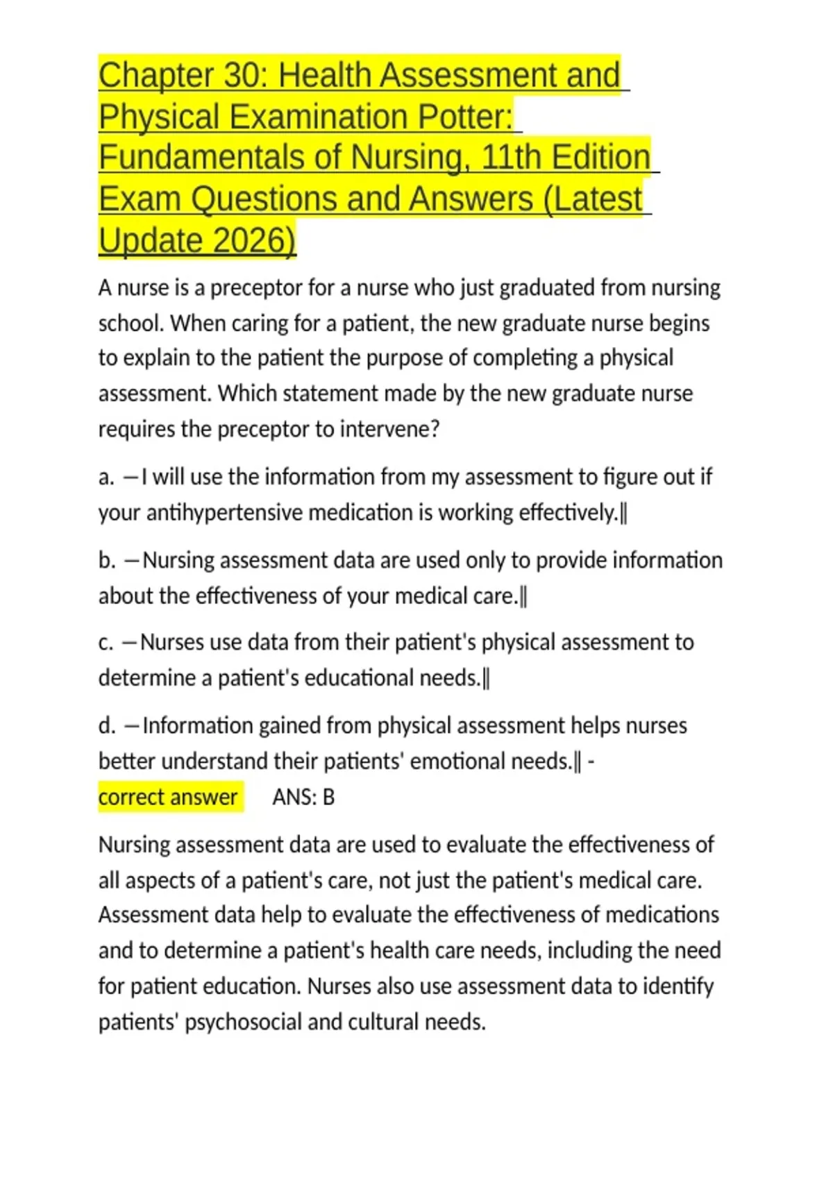 Chapter 30 Health Assessment and Physical Examination Potter Fundamentals of Nursing, 11th Edition Exam Questions and Answers (Latest Update 2026).docx