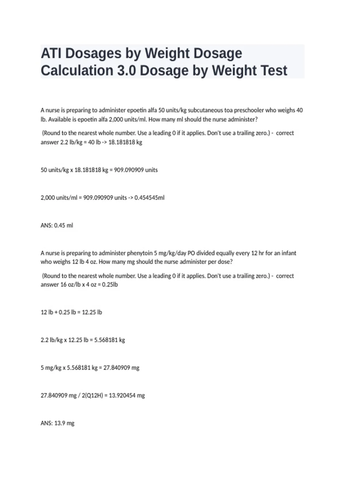 , 2026 ? Focused on Page 2 of 10 ATI Dosages by Weight Dosage Calculation 3.0 Dosage by Weight Test