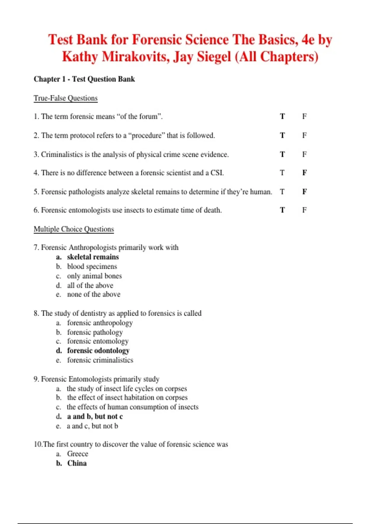 3. Criminalistics is the analysis of physical crime scene evidence. T F