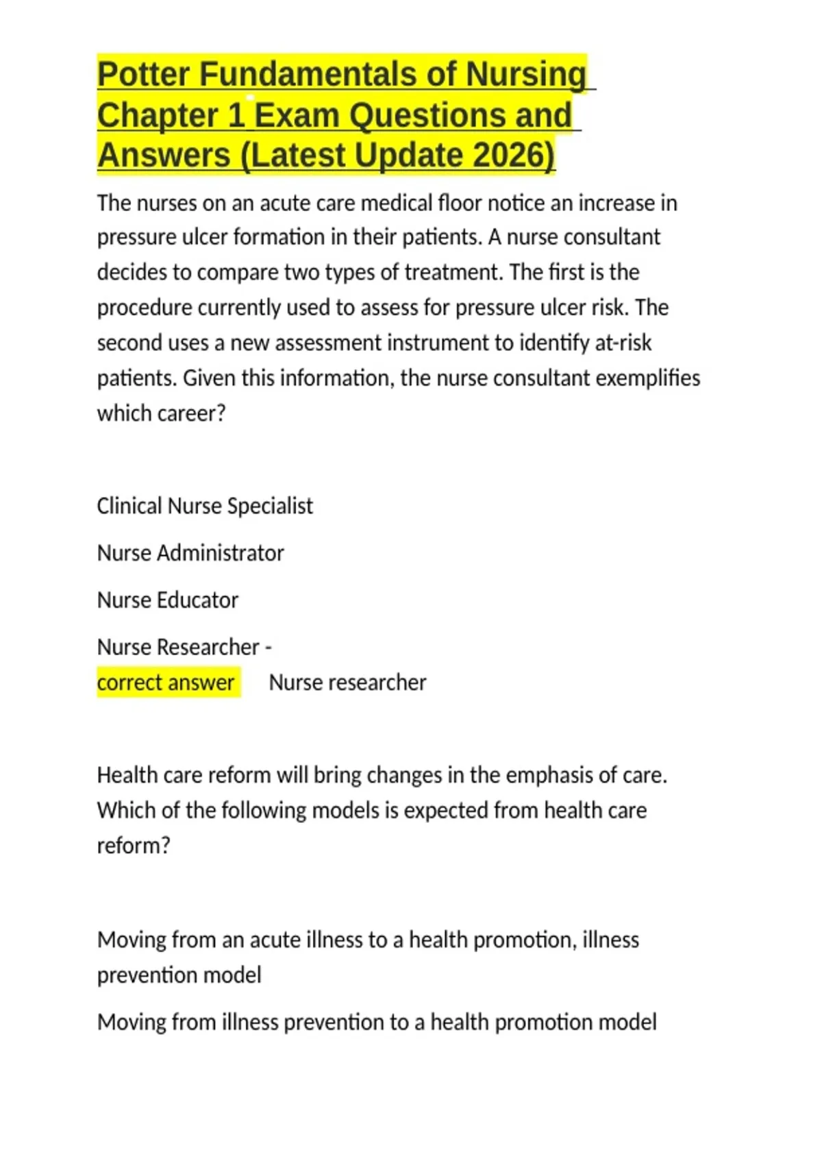 Potter Fundamentals of Nursing Chapter 1 Exam Questions and Answers (Latest Update 2026).docx