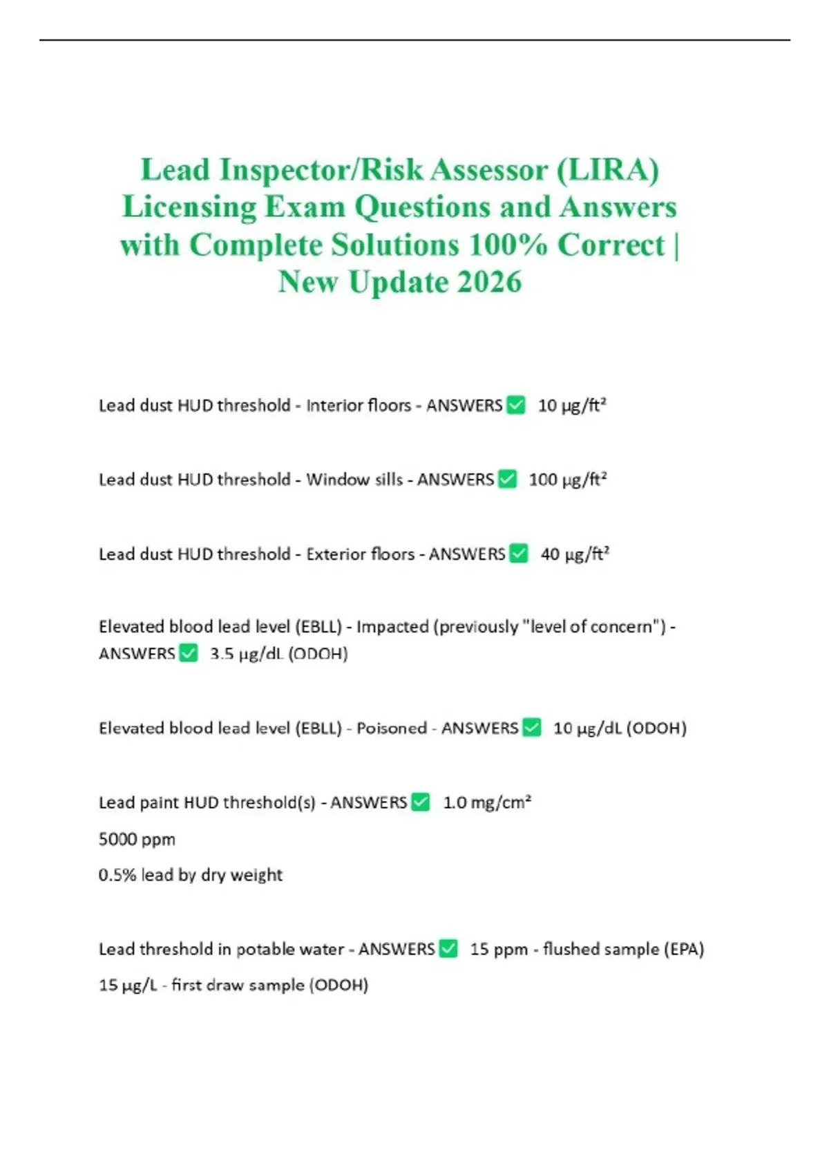 Lead Inspector/Risk Assessor (LIRA) Licensing Exam Questions and Answers with Complete Solutions 100% Correct | New Update 2026 HUD/EPA Lead Inspector & Lead Risk Assessor licensing exam material
