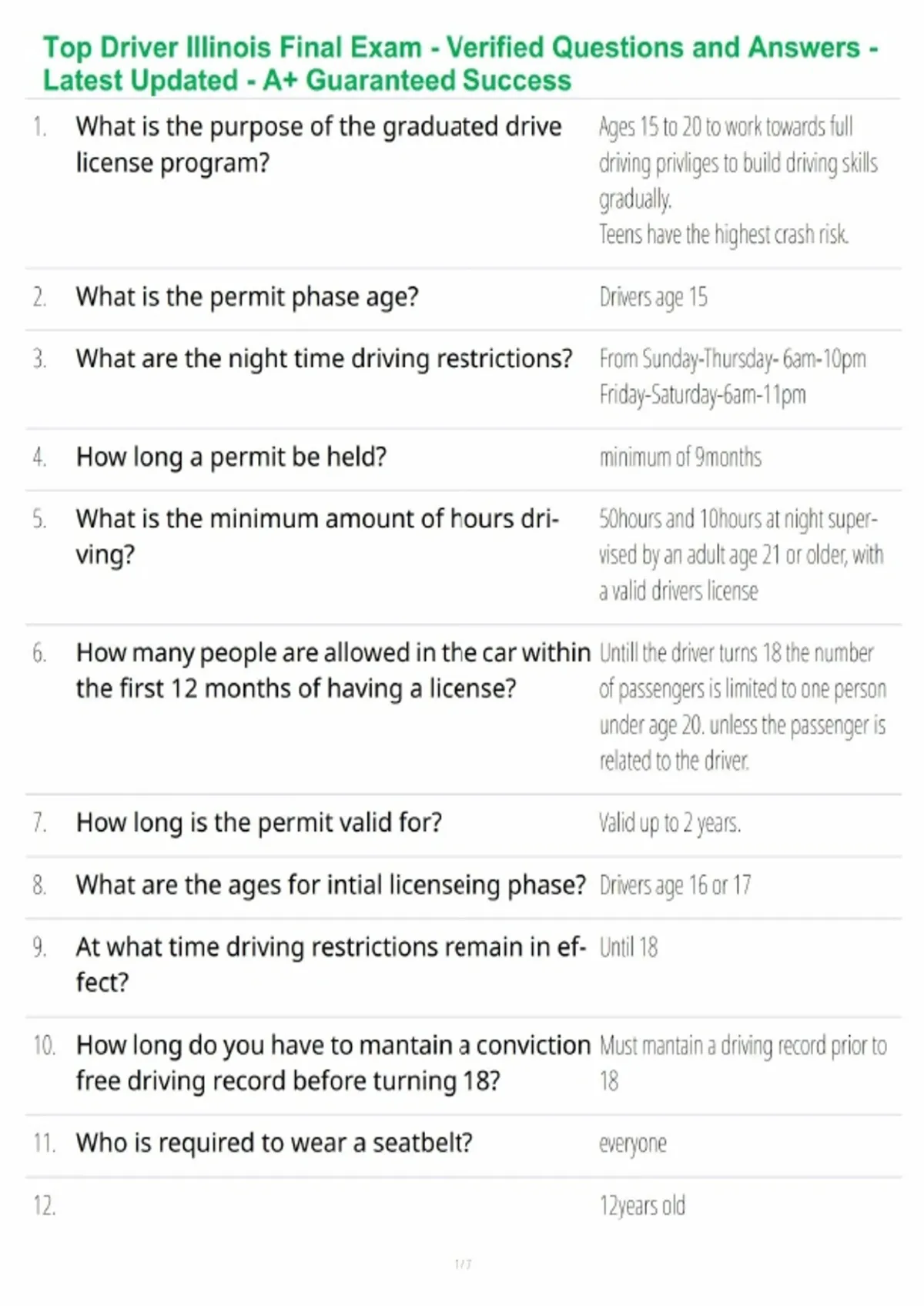 This Top Driver Illinois Final Exam study guide is a powerful exam-prep resource designed to help students confidently pass their driver education final exam on the first attempt. Featuring carefully verified questions and answers aligned with current Illinois driving laws and Top Driver curriculum standards, this guide covers essential topics such as road signs, traffic laws, safe driving practices, and defensive driving techniques. Clear, easy-to-understand explanations simplify complex rules and improve retention. Whether you are preparing for your first attempt or reviewing for a retake, this comprehensive study guide delivers accuracy, confidence, and guaranteed success.