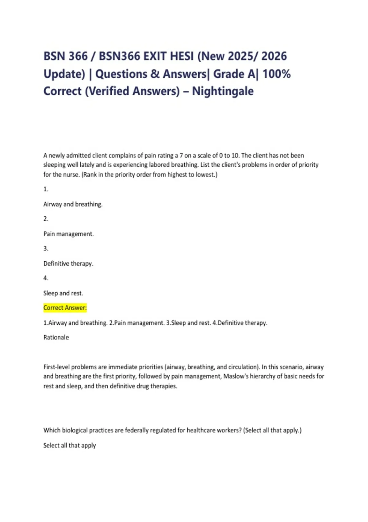 ,2026 ? Focused on Page 2 of 61 BSN 366 BSN366 EXIT HESI (New 2025- 2026 Update) Questions & Answers