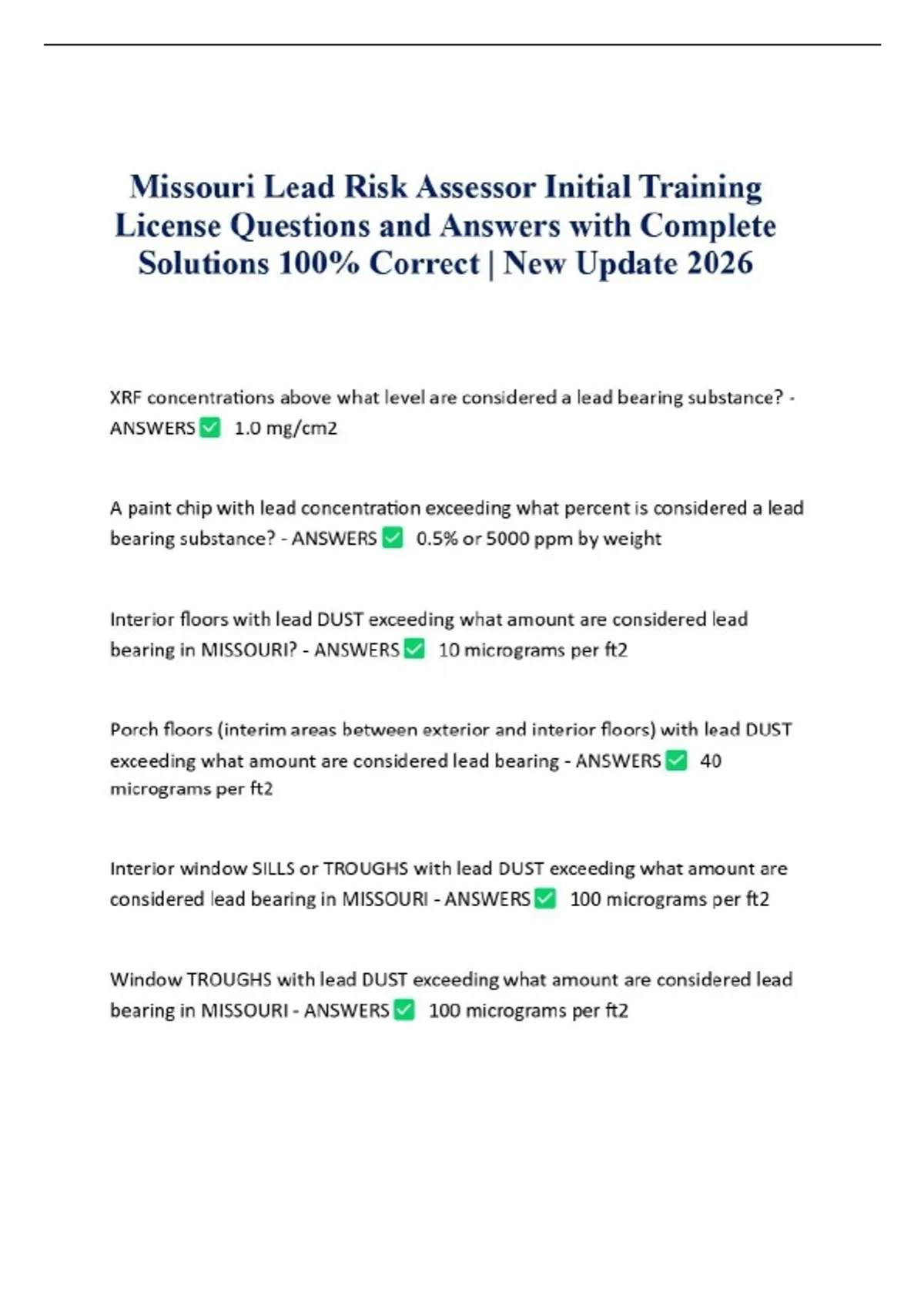 Missouri Lead Risk Assessor Initial Training License Questions and Answers with Complete Solutions 100% Correct | New Update 2026