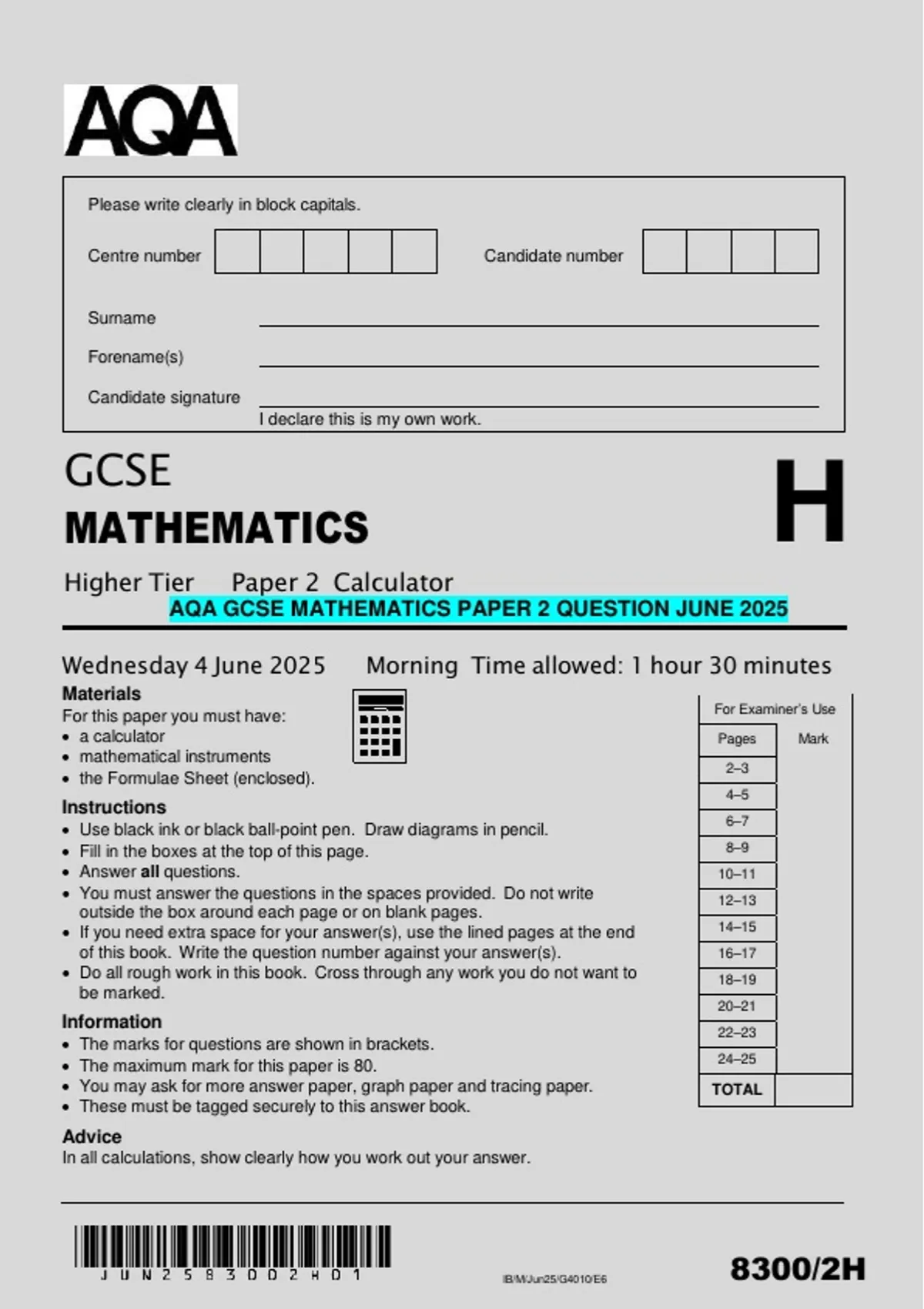 AQA GCSE MATHEMATICS PAPER 2 QUESTION JUNE 2025