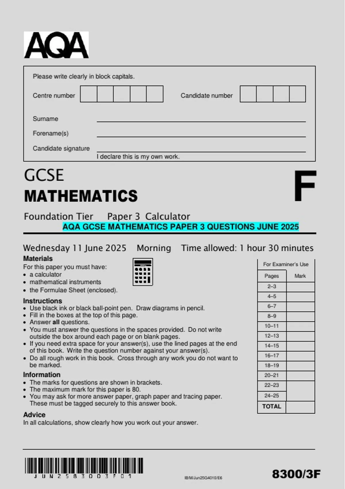 AQA GCSE MATHEMATICS PAPER 3 QUESTIONS JUNE 2025