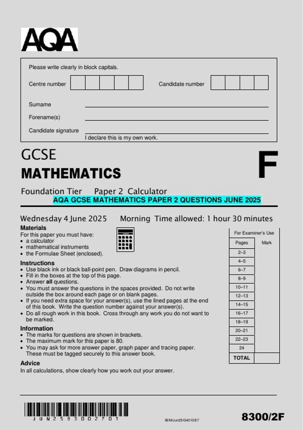 AQA GCSE MATHEMATICS PAPER 2 QUESTIONS JUNE 2025