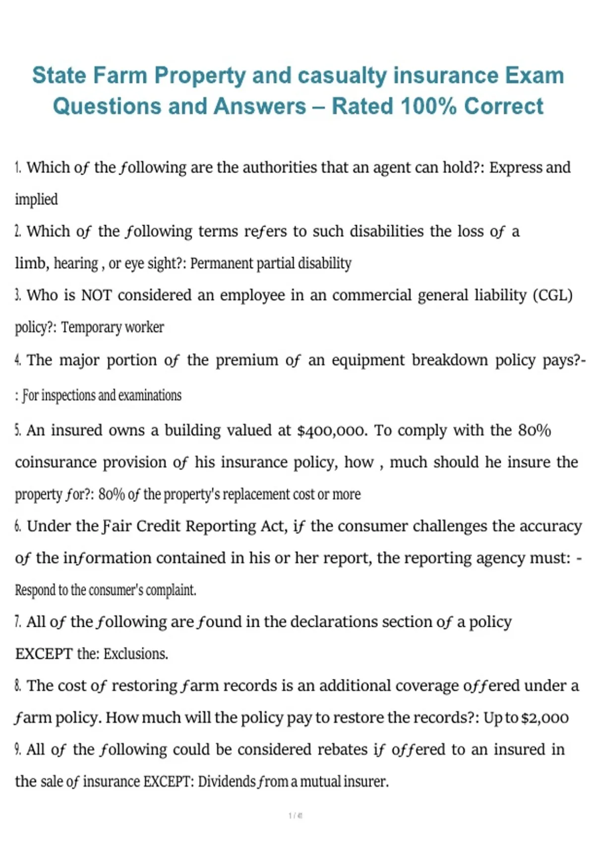 This document provides State Farm Property and Casualty insurance exam questions with fully verified answers rated 100% correct. It covers key topics including property and casualty coverage, policy provisions, exclusions, endorsements, underwriting fundamentals, and claims handling concepts tested on the exam. The material is designed for comprehensive review, self-testing, and confident preparation for exam success.