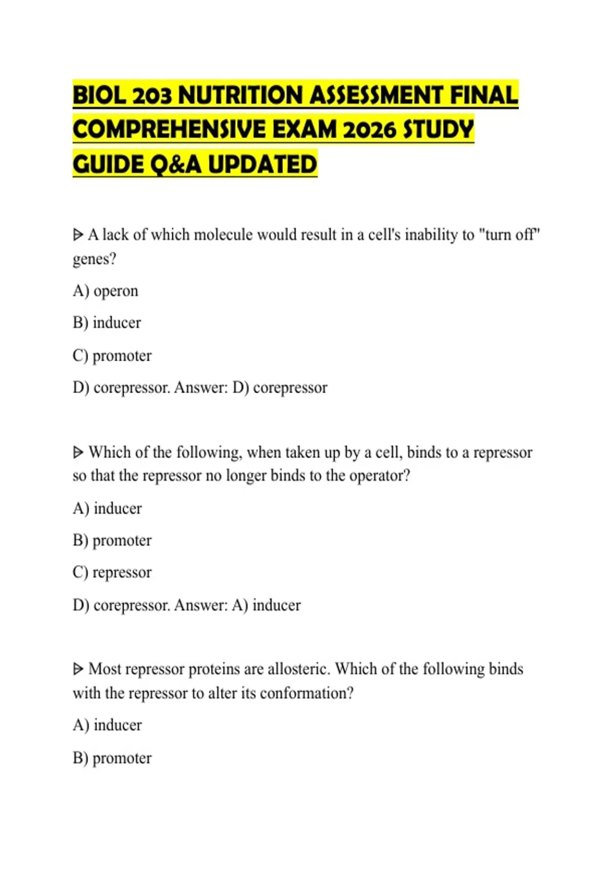 BIOL 203 NUTRITION ASSESSMENT FINAL COMPREHENSIVE EXAM 2026 STUDY GUIDE Q&A UPDATED