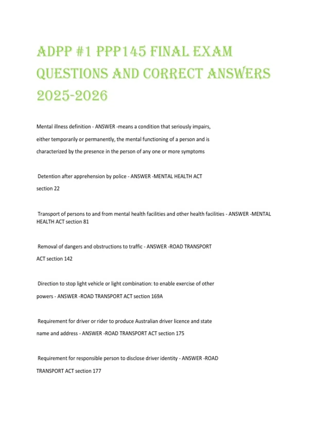 Transport of persons to and from mental health facilities and other health facilities - ANSWER -MENTAL