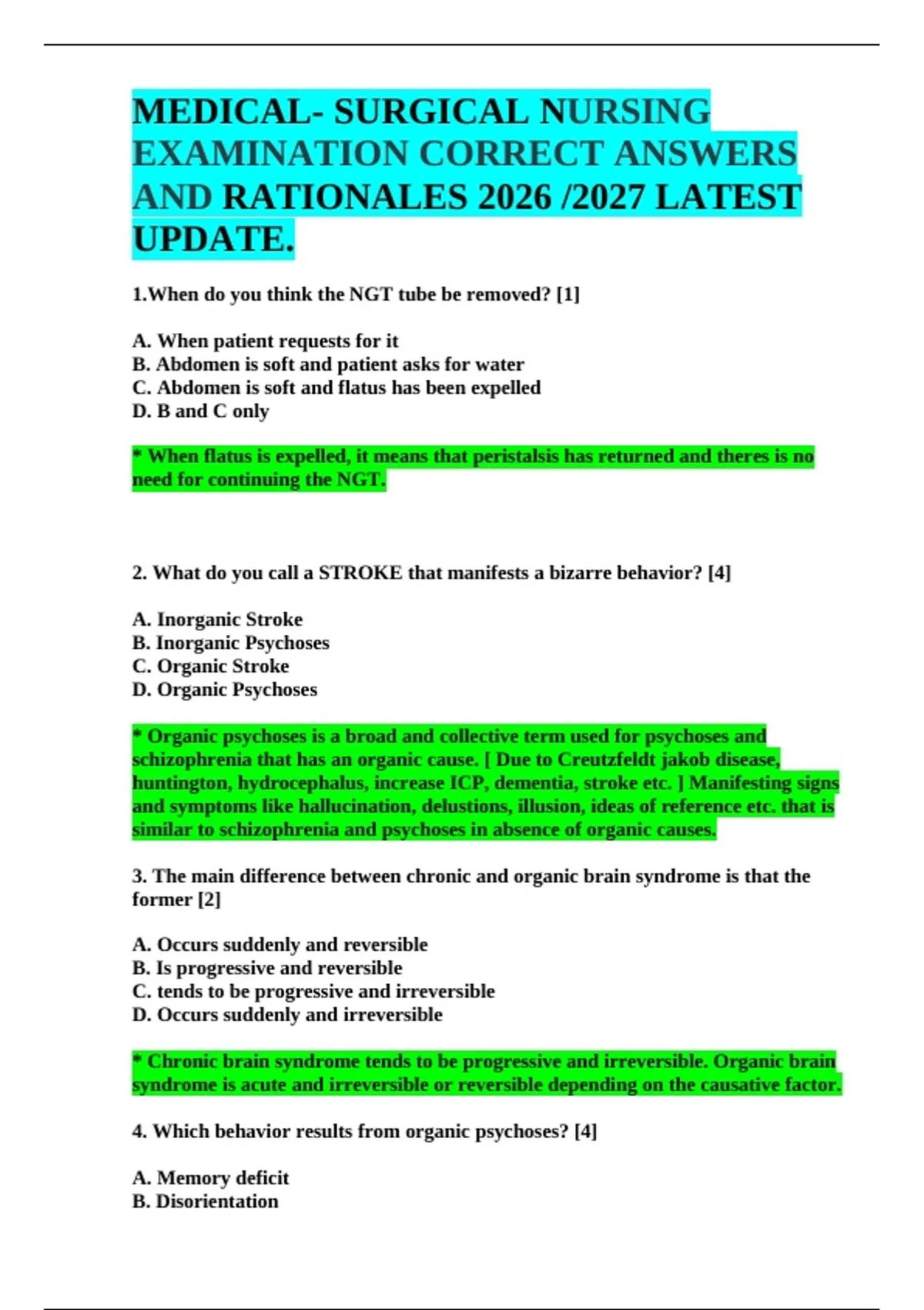 Ace your upcoming NLE, local nursing board, or NCLEX-style exams with this comprehensive Medical-Surgical Nursing examination reviewer! Featuring the latest 2026/2027 updates, every question comes with the correct answer plus detailed, easy-to-understand rationales explaining why each choice is right or wrong. Covers high-yield topics including stroke, osteoarthritis, TB (DOH categories & DOTS), colostomy care, tracheostomy, glaucoma, Meniere’s disease, Parkinson’s, dementia, CVA, appendicitis, osteoporosis, and more. Perfect for last-minute review, concept mastery, and boosting your confidence to pass on the first try. Downloaded and trusted by top-performing nursing students
