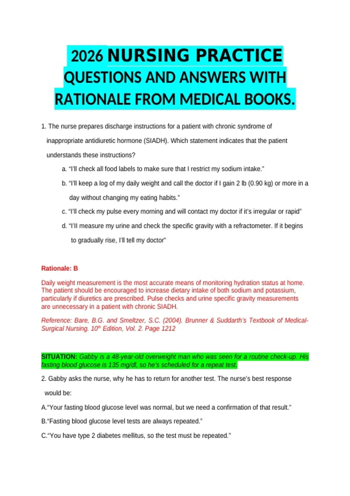 2026 NURSING PRACTICE QUESTIONS AND ANSWERS WITH RATIONALE FROM MEDICAL BOOKS.